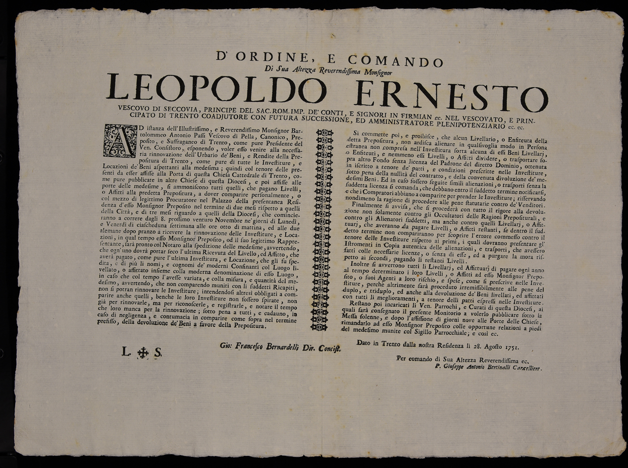 Proclama sui beni della Prepositura di Trento dati in affitto emanato il 28 agosto 1751 da Leopoldo Ernesto Firmian, sottoscritto da Giovanni Francesco Bernardelli (dir. concistoro) e Giuseppe Antonio Bertinalli (cancelliere). Stampa attribuibile alla tipografia Parone di Trento in base al raffronto di caratteri e fregi.