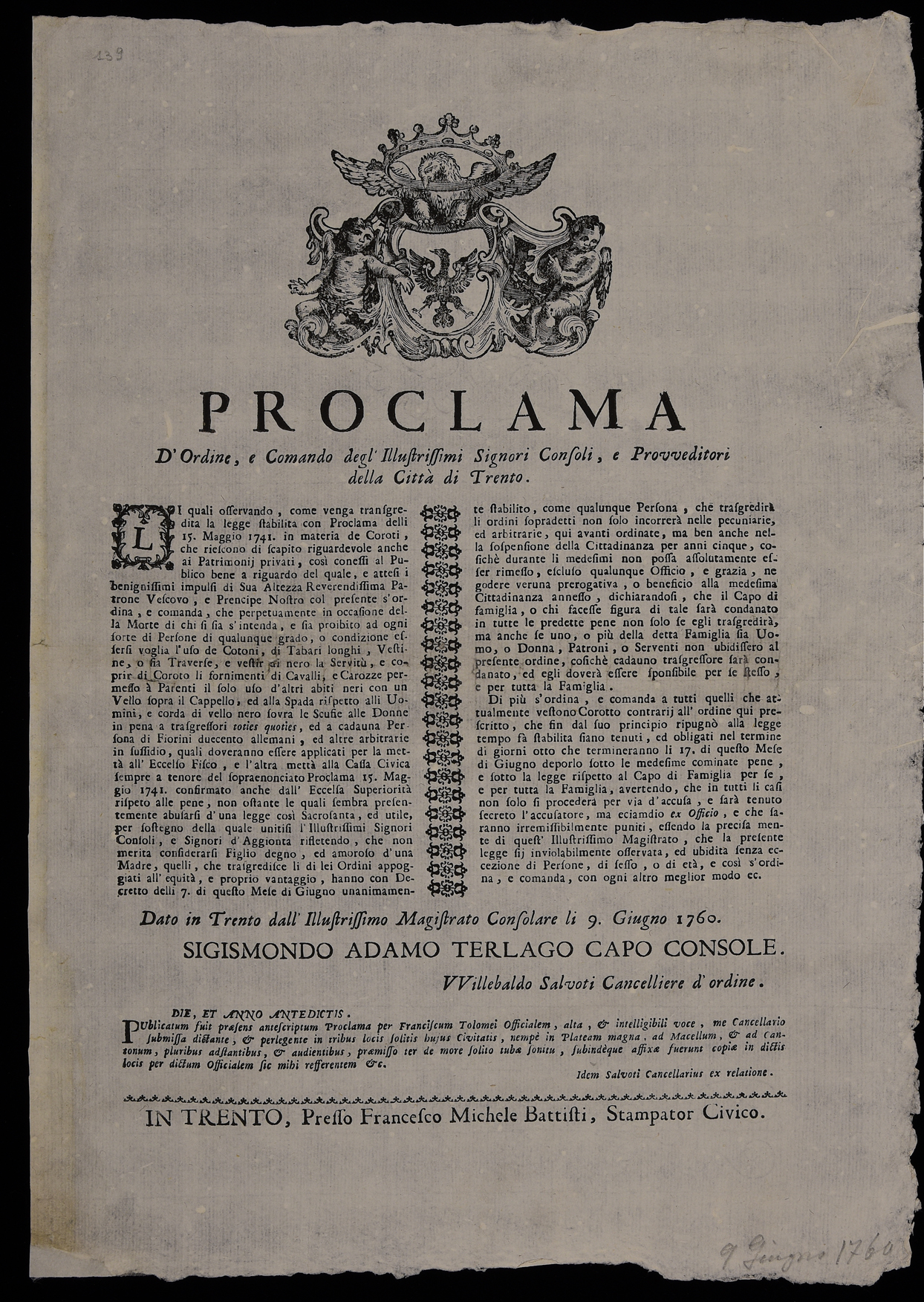 Proclama del Magistrato consolare di Trento sulle usanze funebri, emanato il 9 giugno 1760, sottoscritto da Sigismondo Adamo Terlago e Willebaldo Salvoti, testo della pubblicazione avvenuto a Trento il 9 giugno 1760 ad opera di Francesco Tolomei alla presenza di Willebaldo Salvoti.
