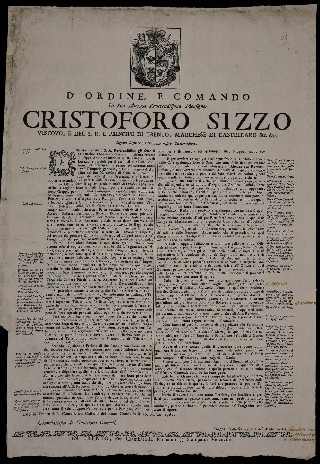 | D'ordine e comando di sua altezza reverendissima monsignor Cristoforo Sizzo vescovo e del S. R. I. principe di Trento, marchese di Castellaro &c. &c. signore signore e padrone nostro clementissimo |
