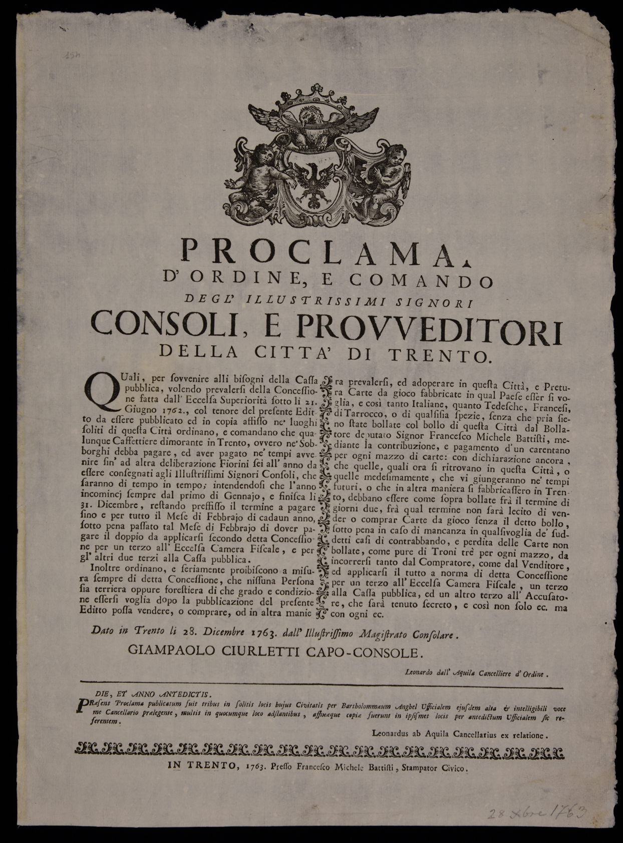 Proclama sul bollo delle carte da gioco emanato il 28 dicembre 1763 dal Magistrato consolare di Trento, stemma del Magistrato consolare di Trento, sottoscritto da Giampaolo Ciurletti (capo console), da Leonardo dall'Acquila (cancelliere) e da Bartolomeo Anghel (officiale).