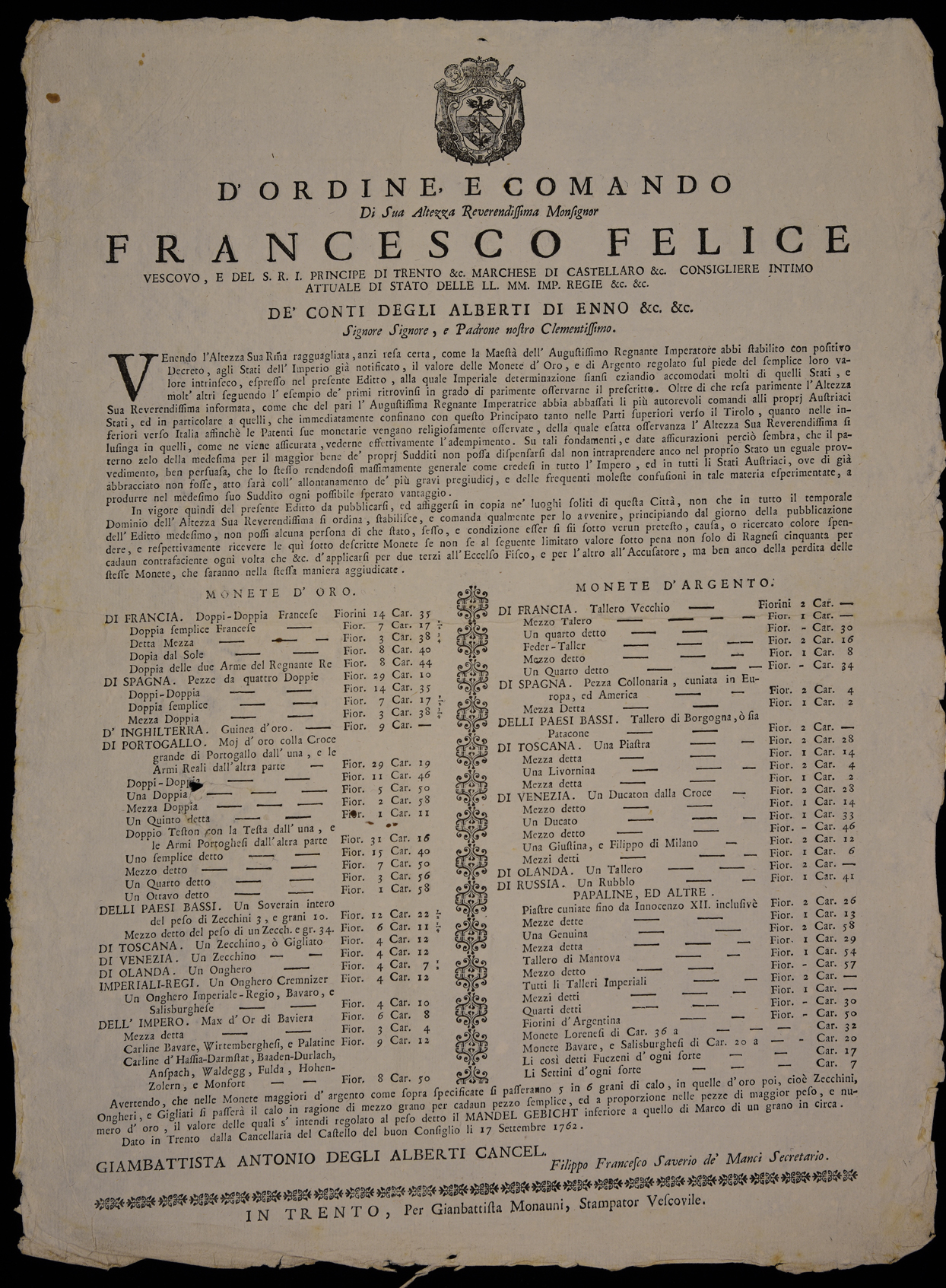 Proclama di Francesco Felice Alberti d'Enno, principe-vescovo di Trento, sul valore delle monete, emanato il 17 settembre 1762, sottoscritto da Giambattista Antonio Alberti e Filippo Francesco Saverio Manci.