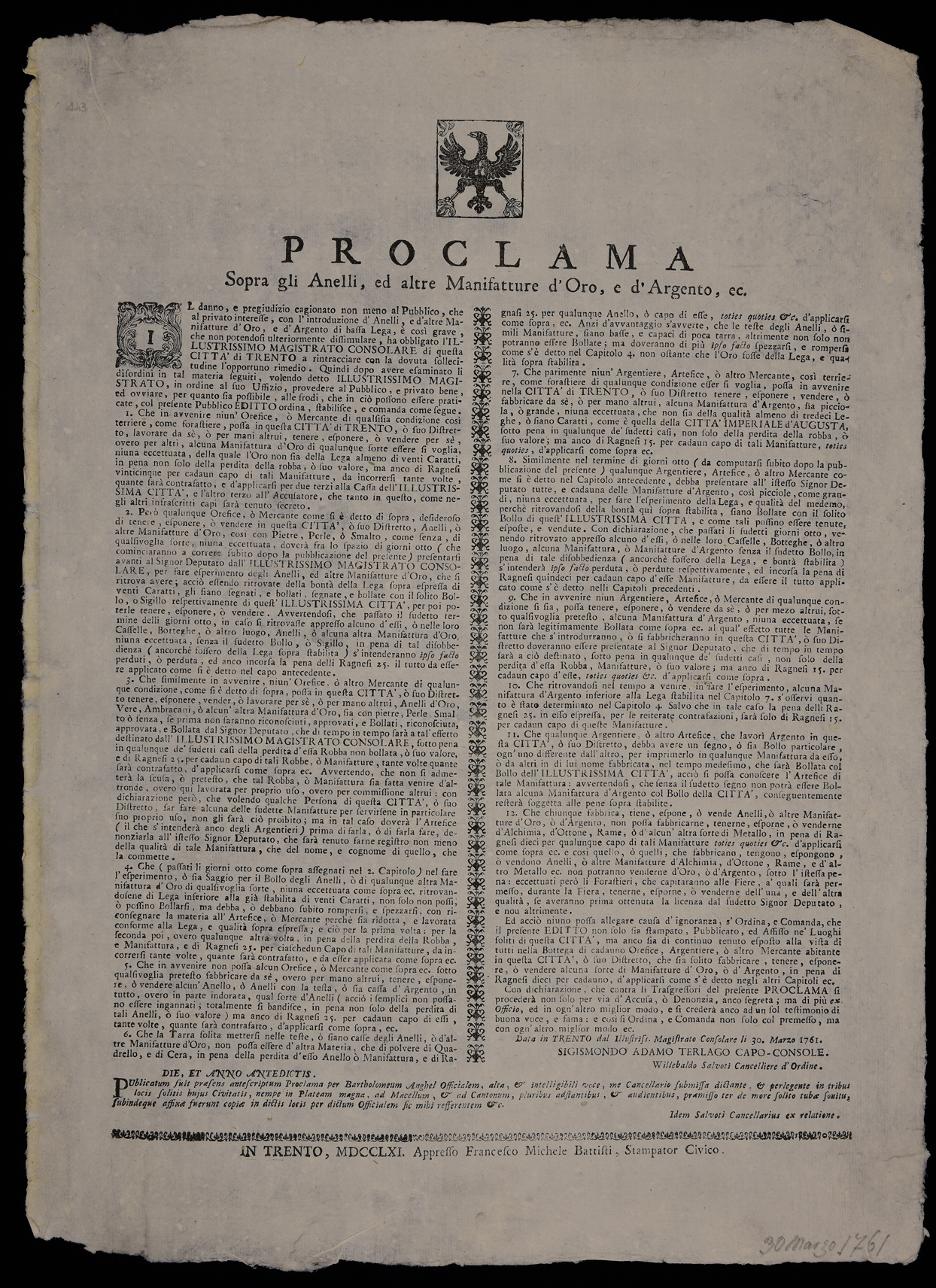 1 manifesto. Proclama sull'oreficeria emanato il 30 marzo 1761 dal Magistrato consolare di Trento, stemma del Magistrato consolare di Trento.