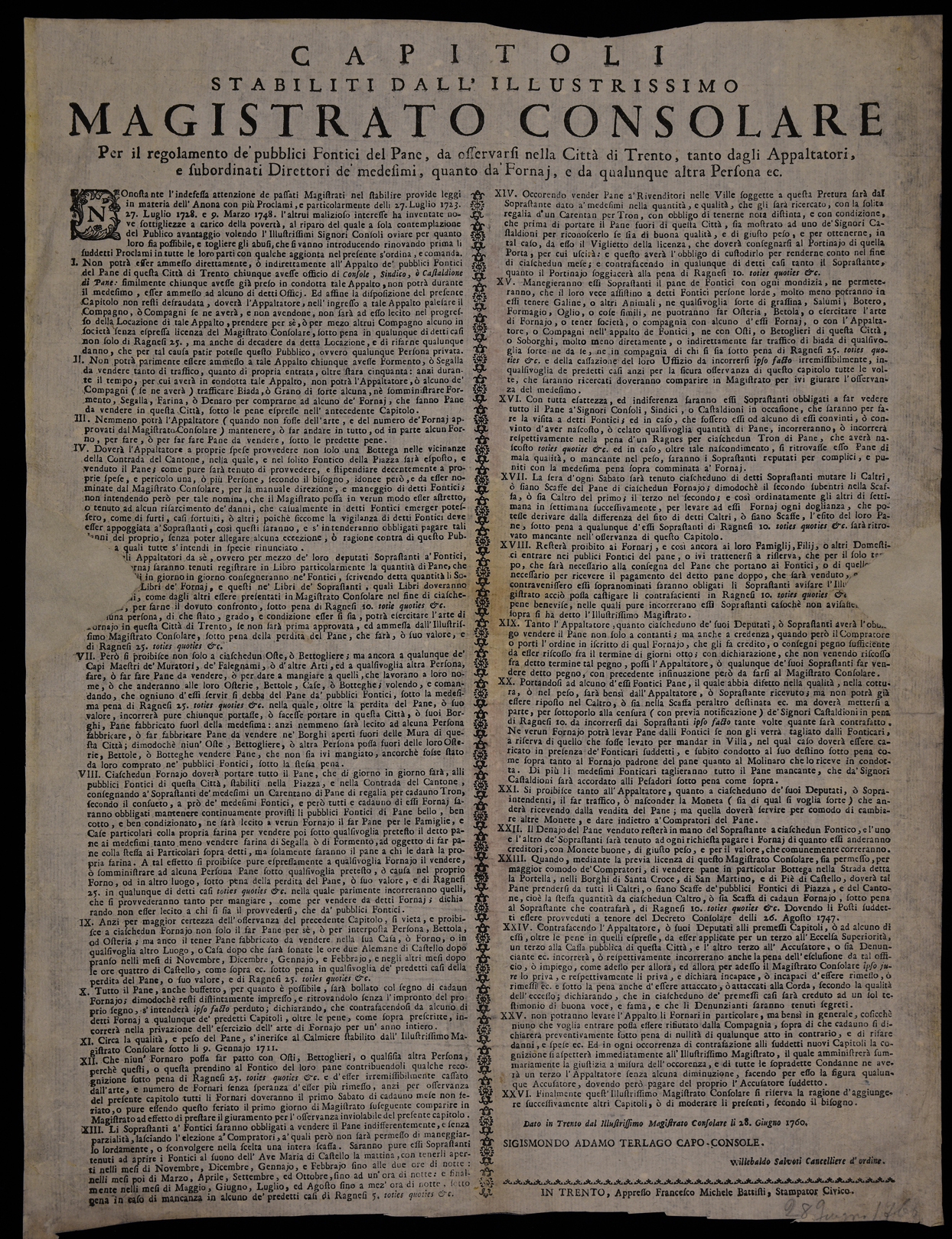 | Capitoli stabiliti dall'illustrissimo magistrato consolare, per il regolamento de' pubblici fontici del pane da osservarsi nella città di Trento tanto dagli appaltatori e subordinati direttori de' medesimi quanto da' fornai e da qualunque altra persona ec. |