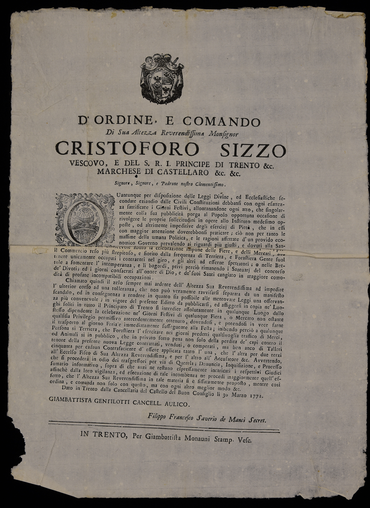 Proclama che vieta fiere e mercati nei giorni festivi emanato il 30 marzo 1772 da Cristoforo Sizzo, principe-vescovo di Trento, stemma di Cristoforo Sizzo, sottoscritto da Giambattista Gentilotti e Filippo Francesco Saverio Manci.