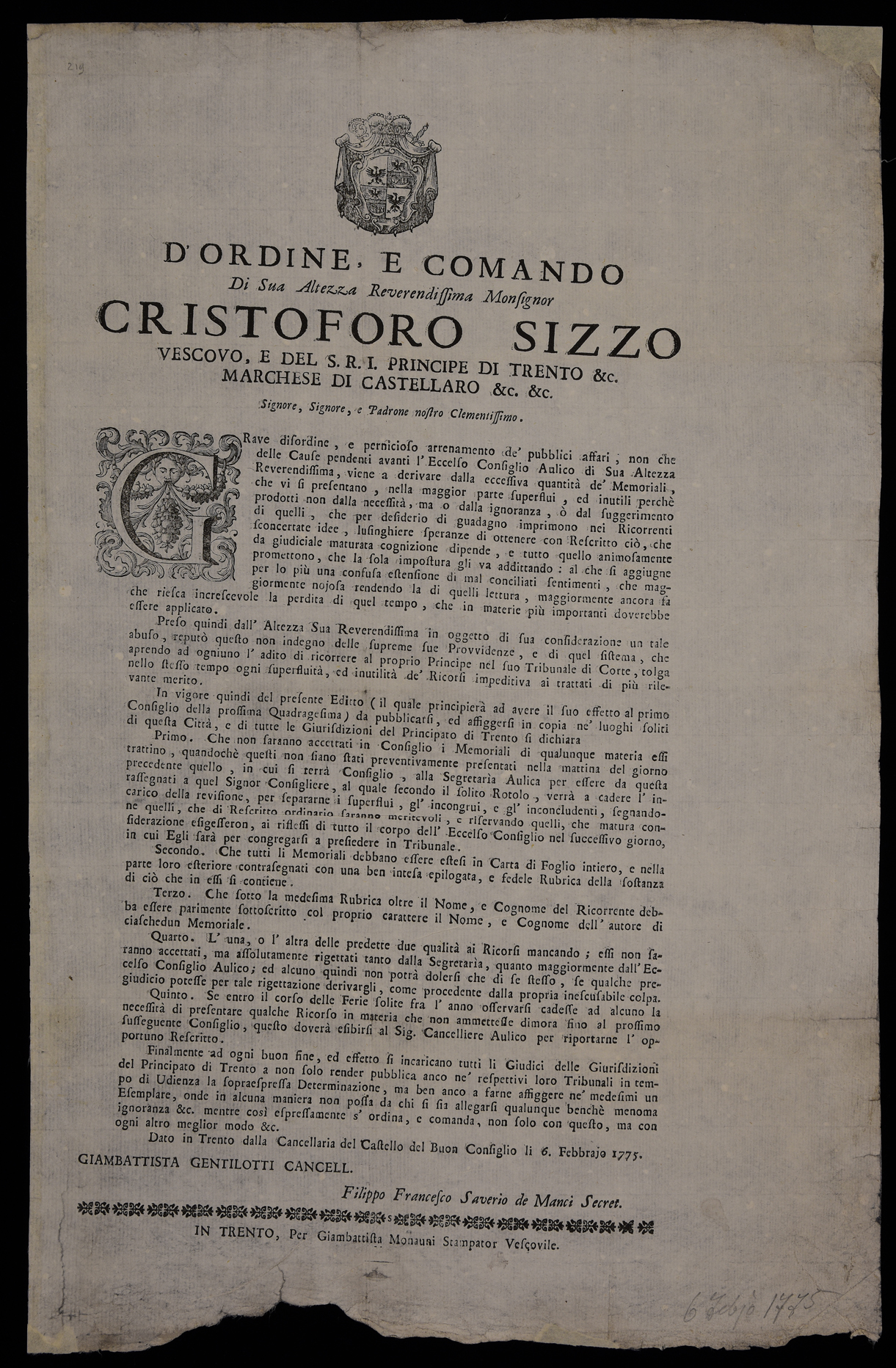1 manifesto. Proclama sulla presentazione di memoriali al Consiglio aulico emanato il 6 febbraio 1775 da Cristoforo Sizzo, principe-vescovo di Trento, stemma di Cristoforo Sizzo.
