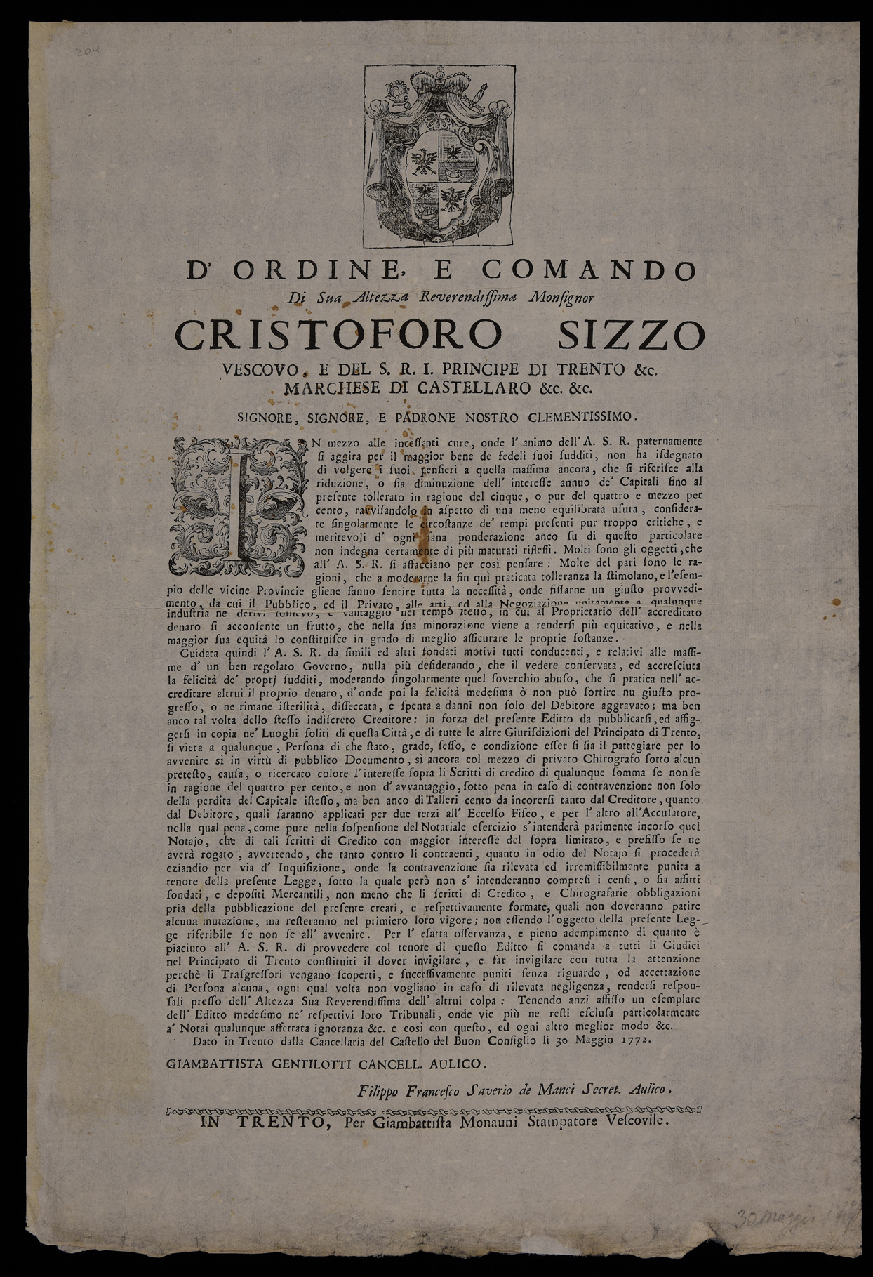 Proclama sull'usura emanato il 30 maggio 1772 da Cristoforo Sizzo, principe-vescovo di Trento, stemma di Cristoforo Sizzo, sottoscritto da Giambattista Gentilotti (cancelliere) e da Filippo Francesco Saverio Manci (segretario).