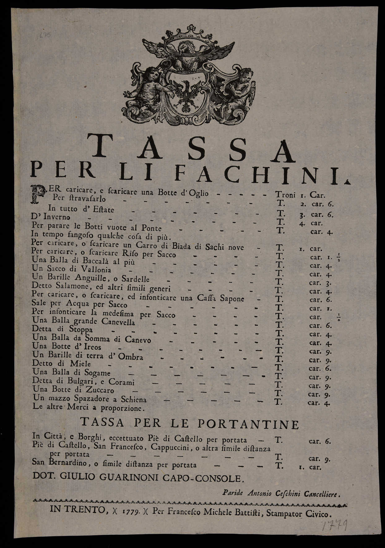 1 manifesto. Proclama che stabilisce il prezzo dei lavori di facchinaggio emanato nel 1779 dal Magistrato consolare di Trento, stemma del Magistrato consolare di Trento, stampa in realtà da attribuire a Simone Girolamo Battisti in quanto posteriore alla morte di Francesco Michele avvenuta nel 1778.