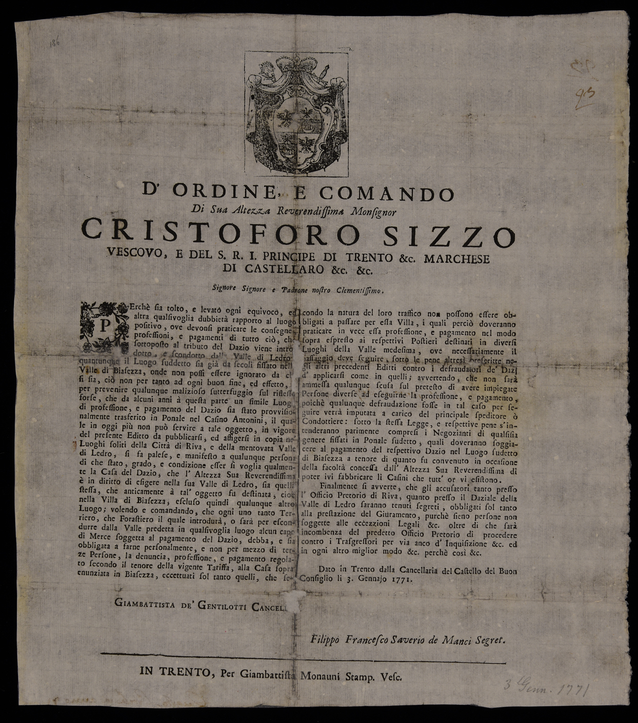 Proclama di Cristoforo Sizzo, principe-vescovo di Trento, sui dazi in Val di Ledro, emanato il 3 gennaio 1771, sottoscritto da Giambattista Gentilotti e Filippo Francesco Saverio Manci.