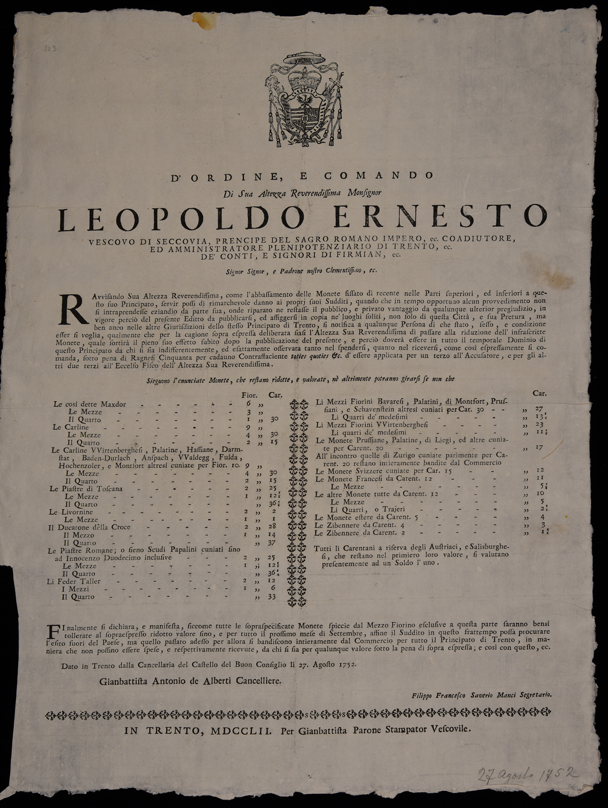 Proclama sul valore delle monete emanato il 27 agosto 1752 da Leopoldo Ernesto Firmian, stemma di Leopoldo Ernesto Firmian, sottoscritto da Giambattista Antonio Alberti (cancelliere) e da Filippo Francesco Saverio Manci (segretario).