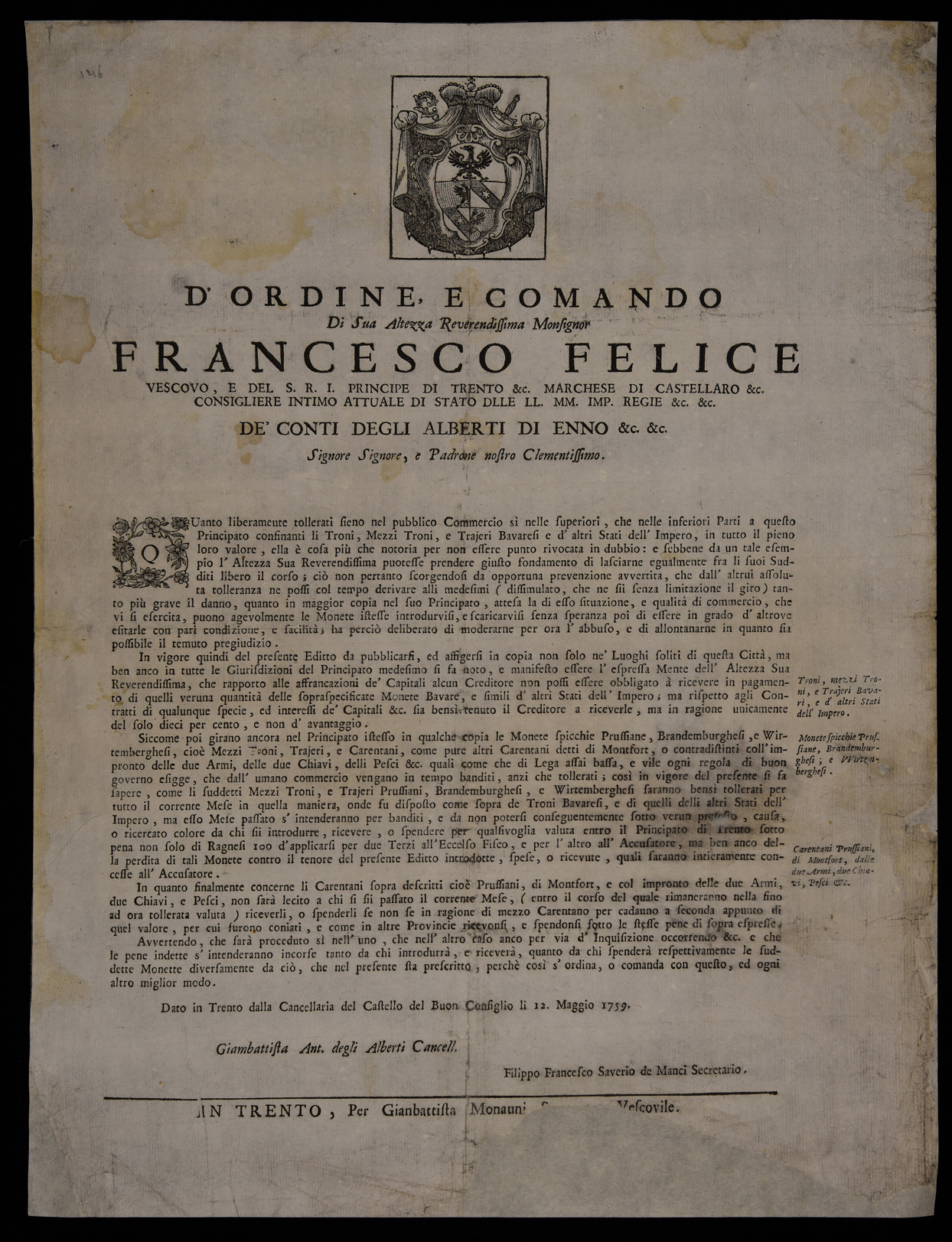 Proclama sulle monete emanato il 12 maggio 1759 da Francesco Felice Alberti d'Enno, principe-vescovo di Trento, stemma di Francesco Felice Alberti d'Enno, sottoscritto da Giambattista Antonio degli Alberti (cancelliere) e da Filippo Francesco Saverio Manci (segretario).