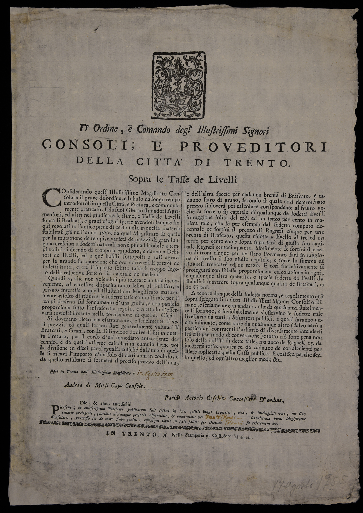 Proclama sulla tassazione di vini e granaglie emanato il 17 agosto 1755 dal Magistrato consolare di Trento, data di emanazione da una nota manoscritta sull'esemplare della Biblioteca comunale di Trento, stemma del Magistrato consolare di Trento, sottoscritto da Andrea de Mersi (capo console) e da Paride Antonio Cesch[i]n[i] (cancelliere), testo della pubblicazione avvenuto a Trento il 17 agosto 1755 ad opera del cavaliere Francesco Tolomei alla presenza di Paride Antonio Ceschini.