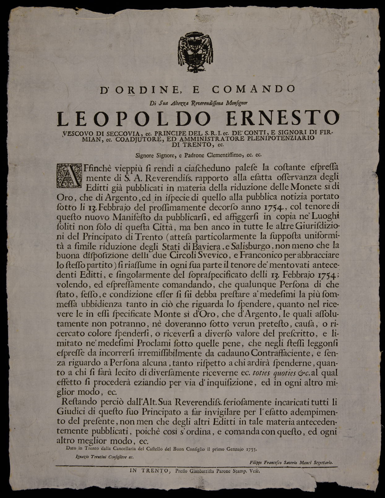 Proclama sul valore delle monete emanato il 1 gennaio 1755 da Leopoldo Ernesto Firmian, stemma di Leopoldo Ernesto Firmian, sottoscritto da Ignazio Trentini (consigliere) e da Filippo Francesco Saverio Manci (segretario).