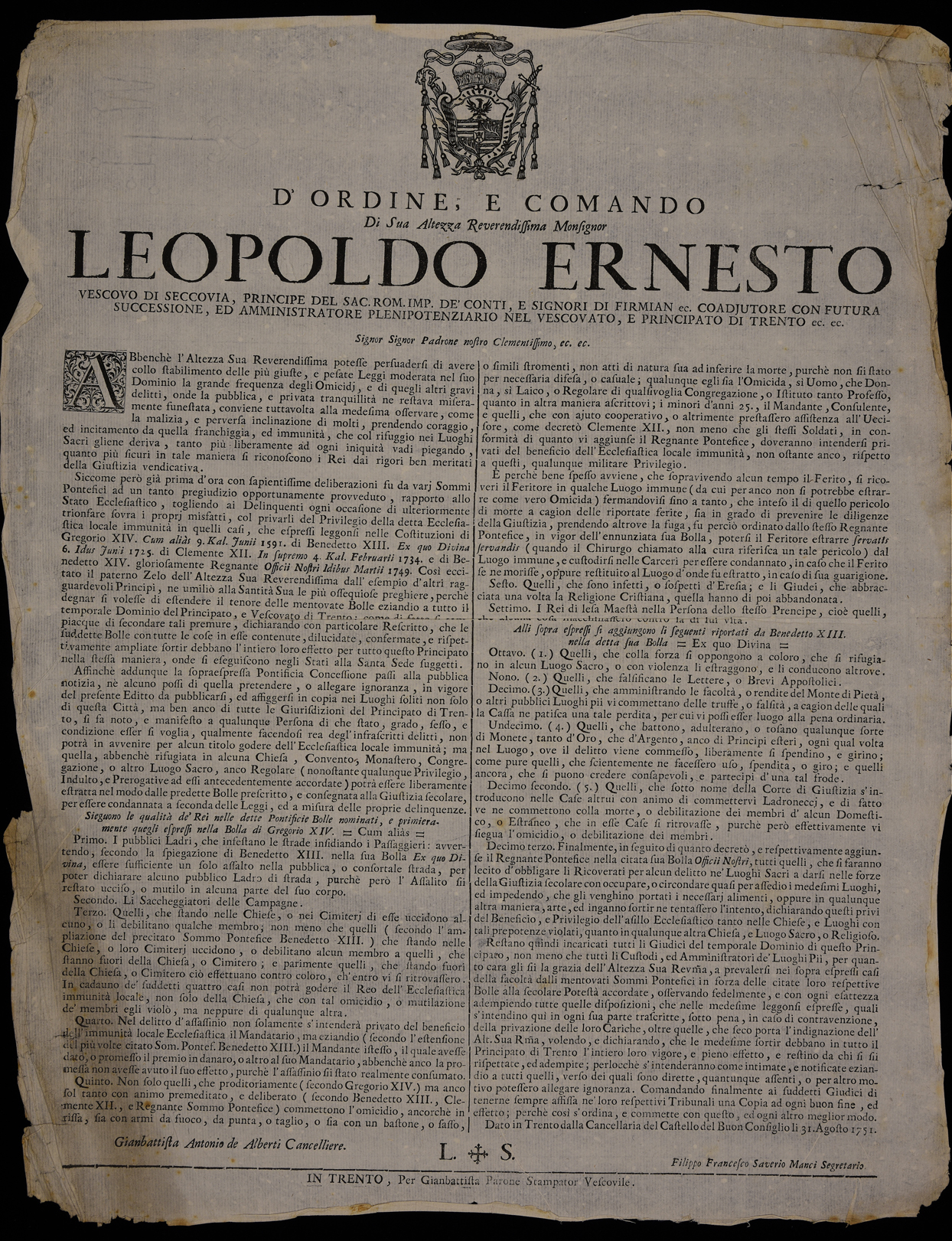 Proclama sull'immunità ecclesiastica emanato il 31 agosto 1751 da Leopoldo Ernesto Firmian, stemma di Leopoldo Ernesto Firmian, sottoscritto da Giambattista Antonio Alberti (cancelliere) e Filippo Francesco Saverio Manci (segretario).
