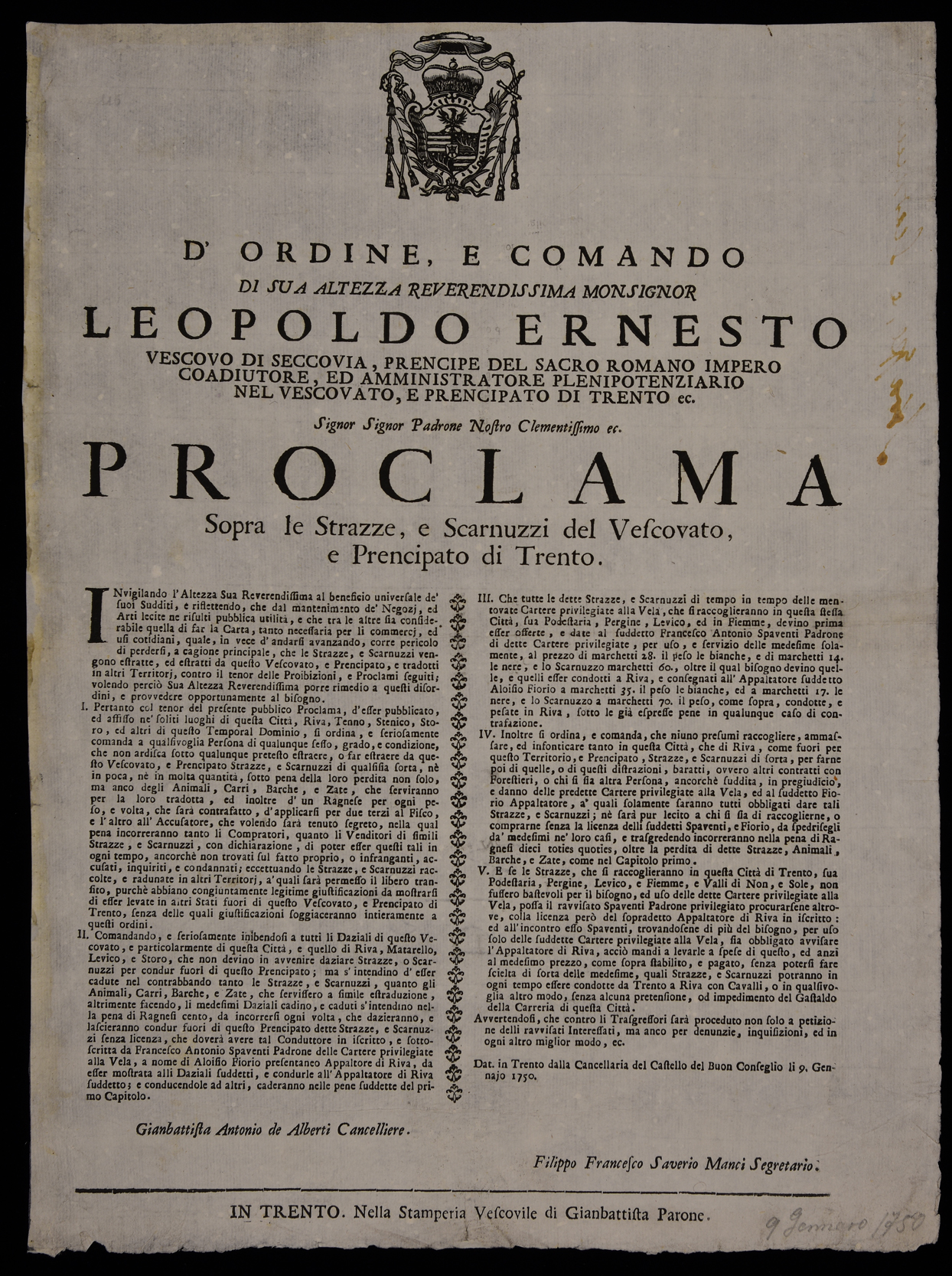 | D'ordine, e comando di sua altezza reverendissima monsignor Leopoldo Ernesto vescovo di Seccovia, prencipe del Sacro Romano Impero coadiutore, ed amministratore plenipotenziario nel vescovato, e prencipato di Trento ec. signor signor padrone nostro clementissimo ec. Proclama sopra le strazze, e scarnuzzi del Vescovato, e Prencipato di Trento |