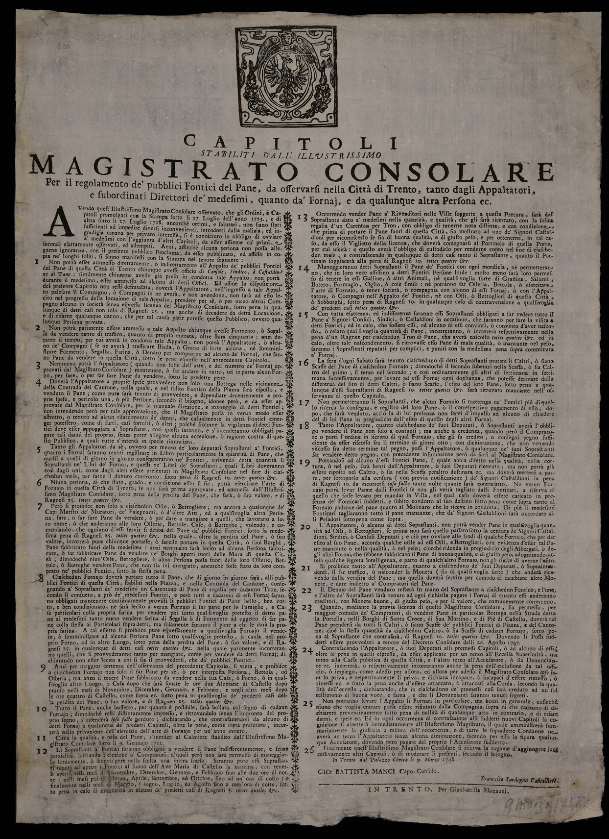 | Capitoli stabiliti dall'illustrissimo magistrato consolare, per il regolamento de' pubblici fontici del pane da osservarsi nella città di Trento tanto dagli appaltatori e subordinati direttori de' medesimi quanto da' fornai e da qualunque altra persona ec. |