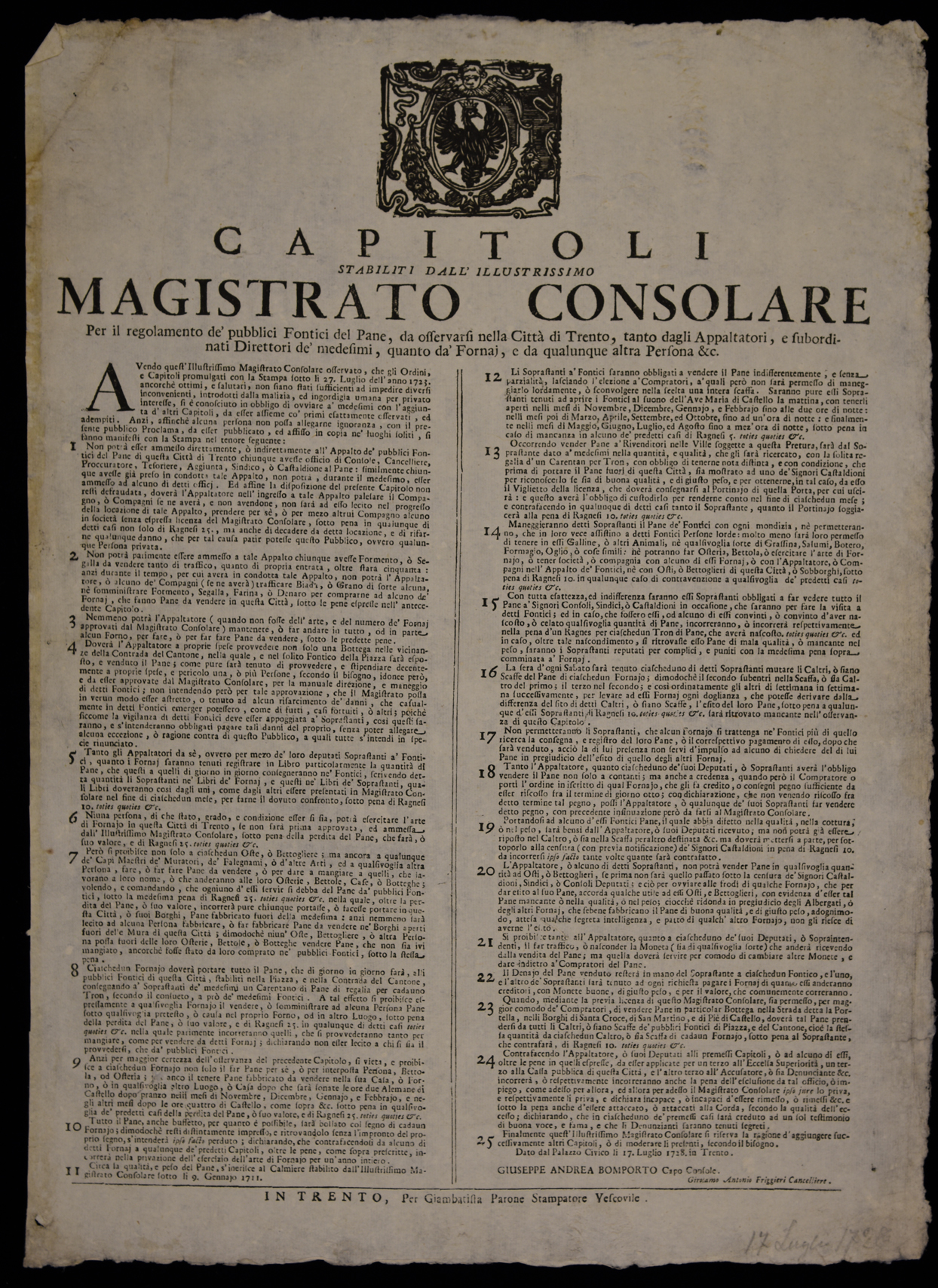 Proclama sulla gestione dei magazzini del pane emanato il 17 luglio 1728 dal Magistrato consolare di Trento, edizione interamente ricomposta rispetto a quella registrata all'ESTER ID 11361 , stemma del Magistrato consolare di Trento