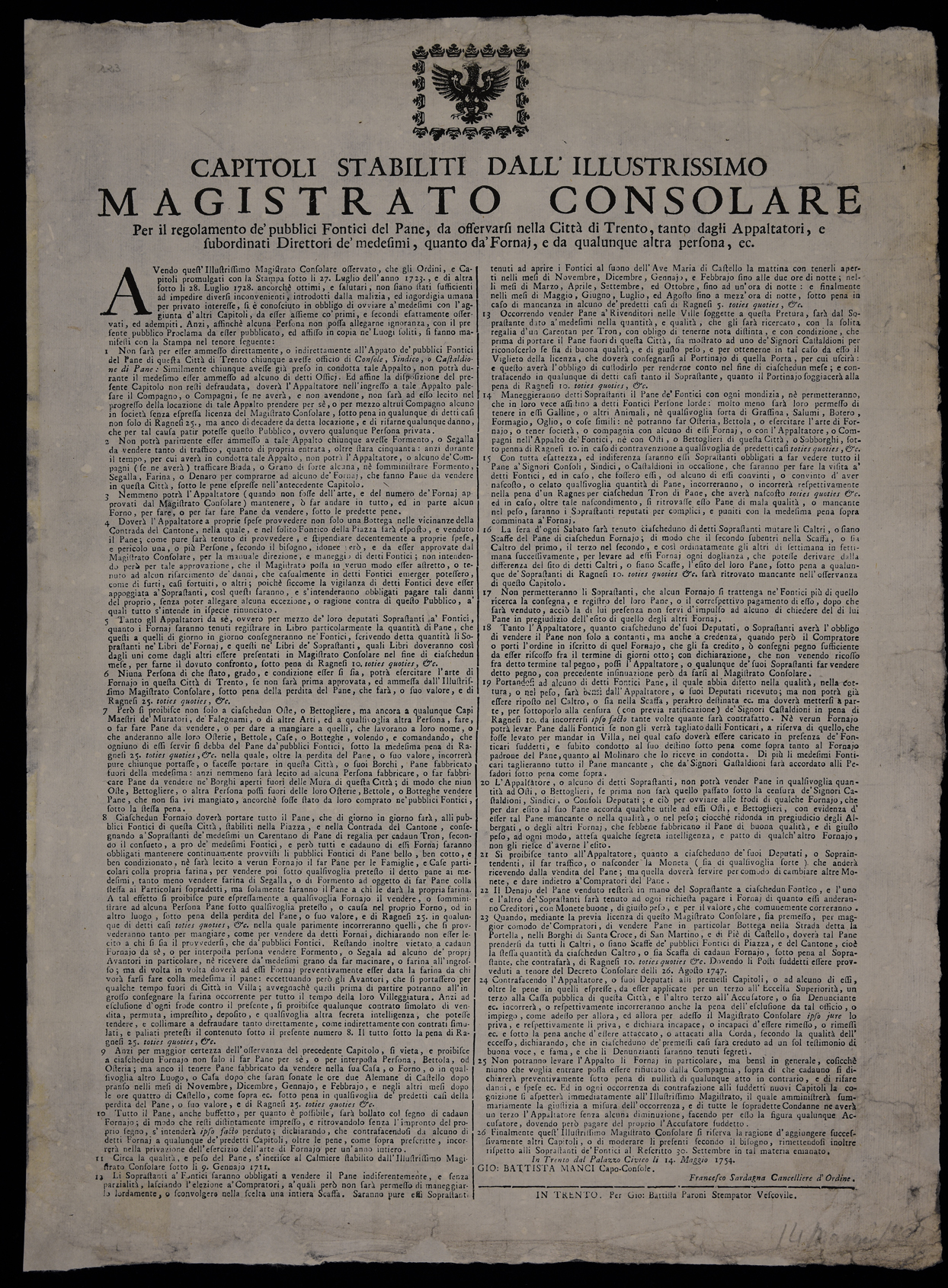 Proclama sulla gestione dei magazzini del pane emanato il 14 maggio 1754 dal Magistrato consolare di Trento, stemma del Magistrato consolare di Trento, sottoscritto da Giovanni Battista Manci (capo console) e da Francesco Sardagna (cancelliere).