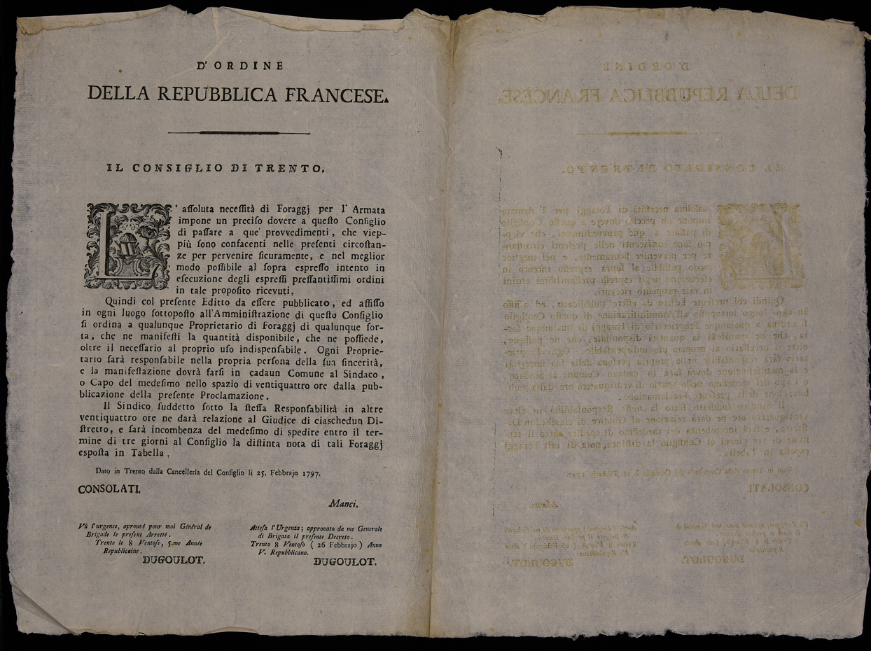 Proclama del Consiglio di Trento che impone la denuncia della quantità di foraggio detenuta, emanato il 25 febbraio 1797, sottoscritto da Filippo Consolati, Giambattista Manci e approvato da Louis François Auguste Mazel du Goulot.