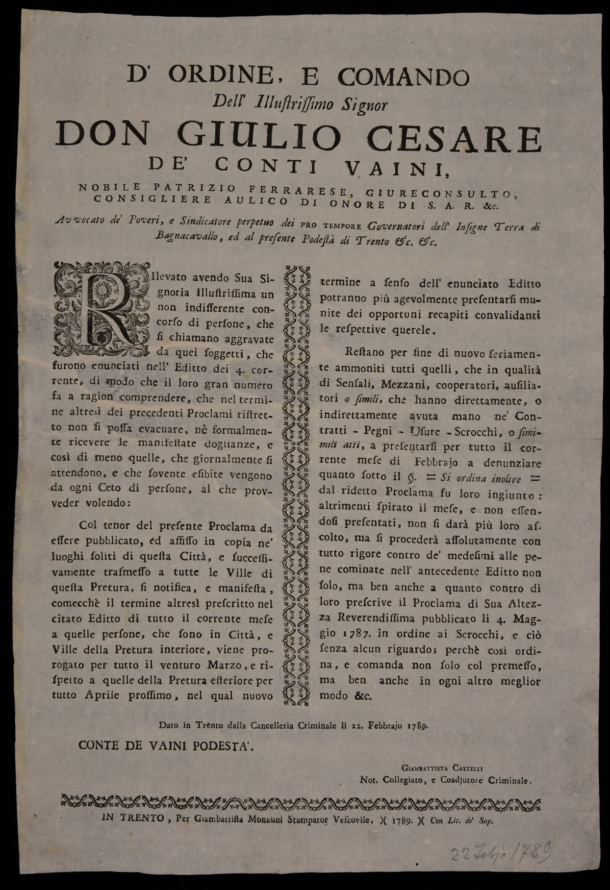 1 manifesto. Proclama sui debiti emanato il 22 febbraio 1789 da Giulio Cesare Vaini, podestà di Trento