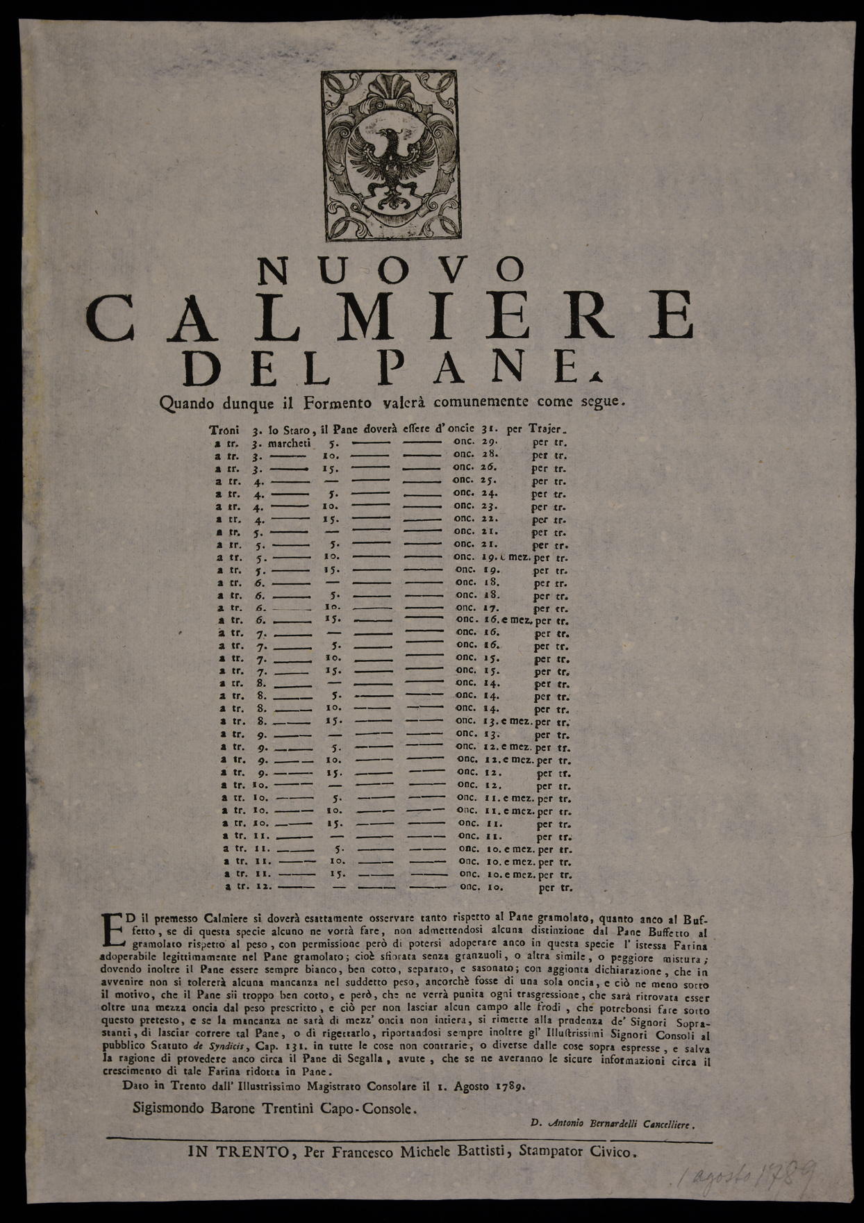 Proclama del Magistrato consolare di Trento sul prezzo del pane, emanato il 1 agosto 1789, sottoscritto da Sigismondo Trentini e Domenico Antonio Bernardelli.