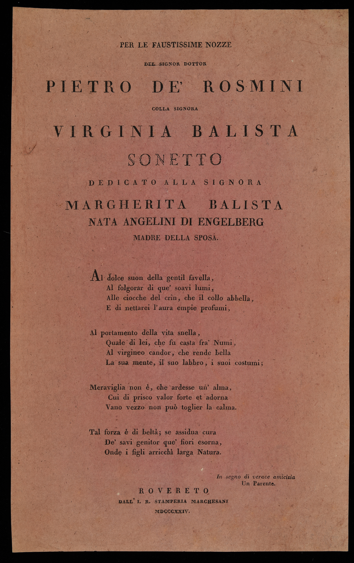 | Per le faustissime nozze del signor dottor Pietro de' Rosmini colla signora Virginia Balista, sonetto ... |