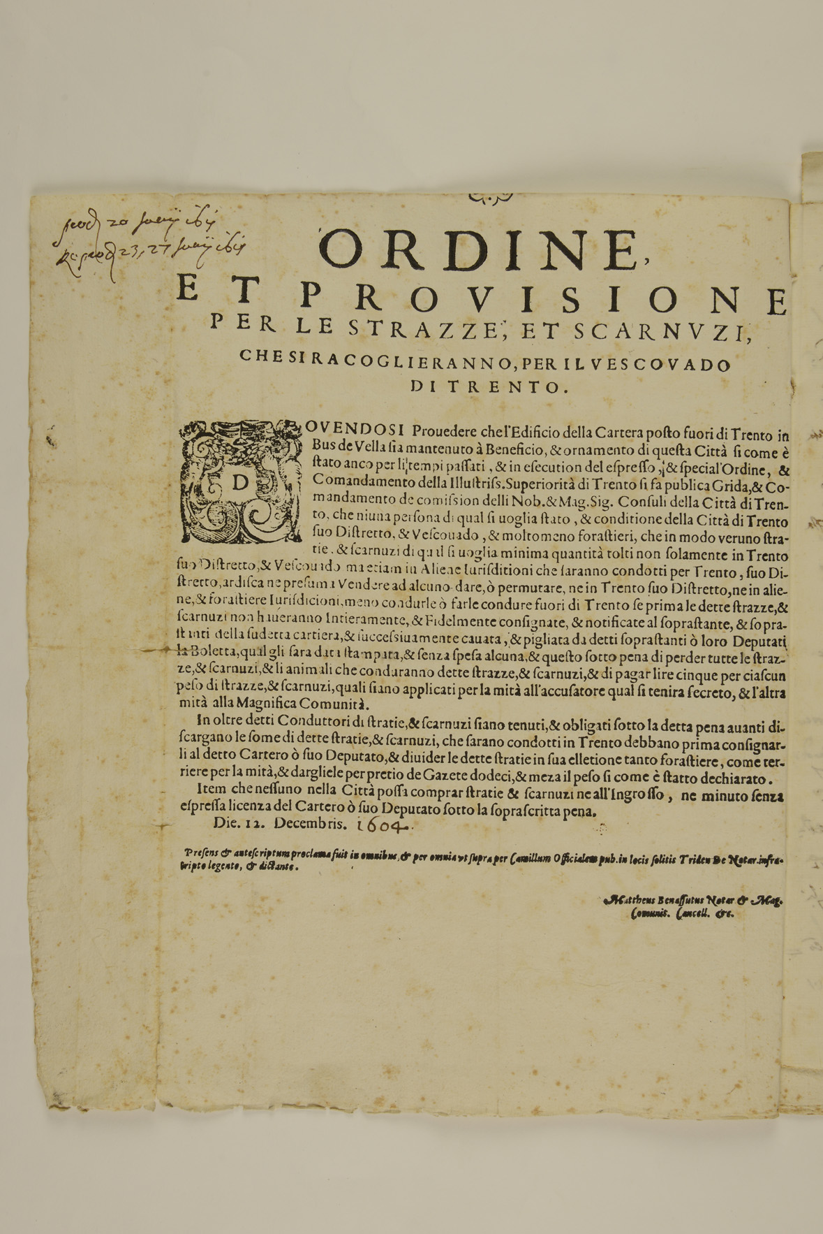 Proclama sulle cartiere emanato il 12 dicembre 1604 da Carlo Gaudenzio Madruzzo, principe-vescovo di Trento, testo del verbale di pubblicazione (effettuata dall'ufficiale Camillo alla presenza di Matteo Benassuti) a stampa in calce.