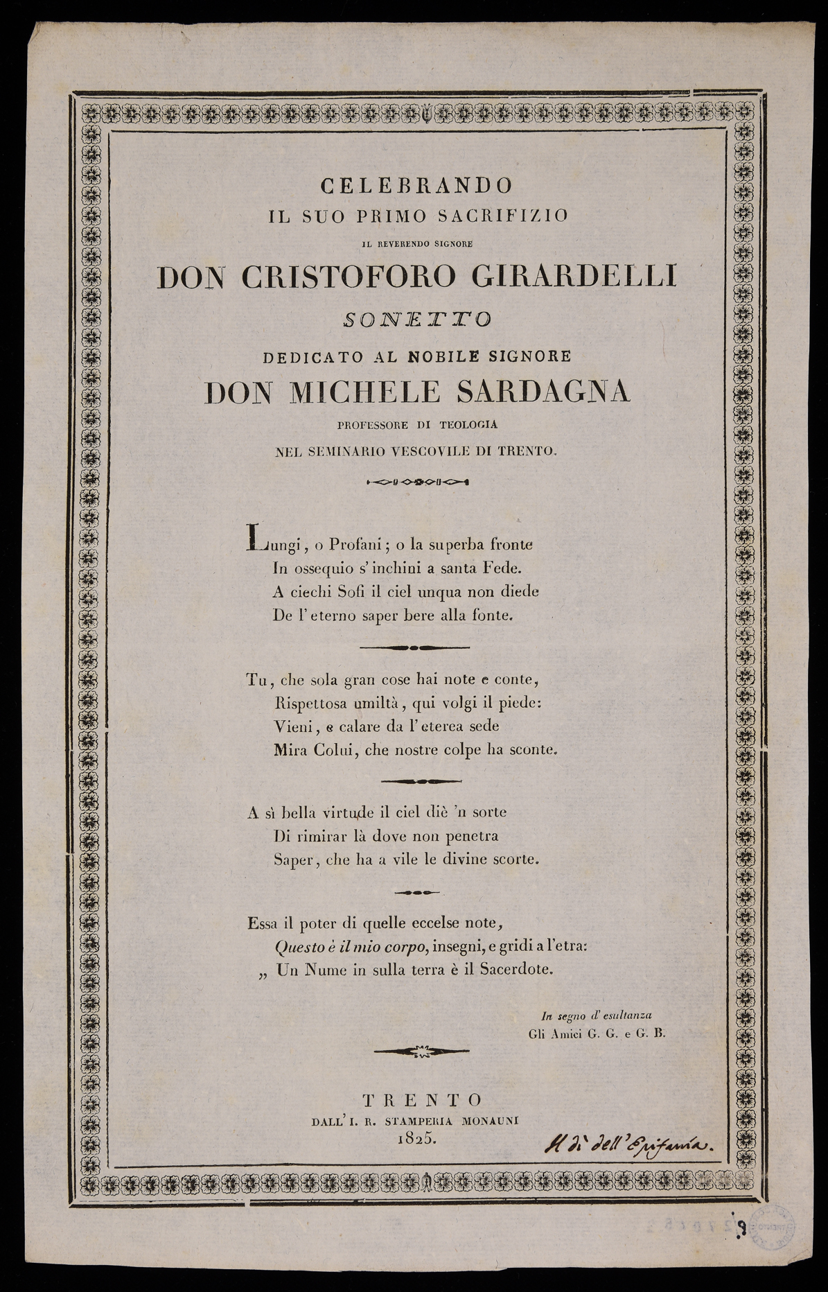 | Celebrando il suo primo sacrifizio il reverendo signore don Cristoforo Girardelli, sonetto dedicato al nobile signore don Michele Sardagna professore di teologia nel Seminario vescovile di Trento |