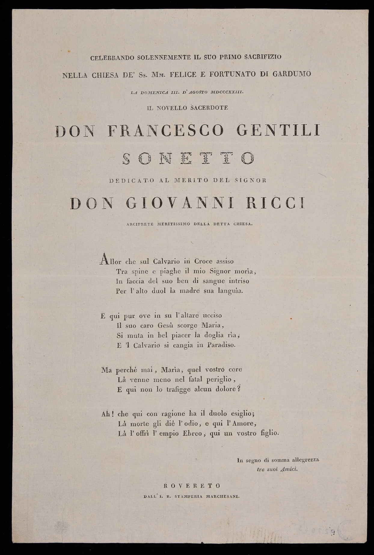 | Celebrando solennemente il suo primo sacrifizio nella Chiesa de' Ss. Mm. Felice e Fortunato ... |