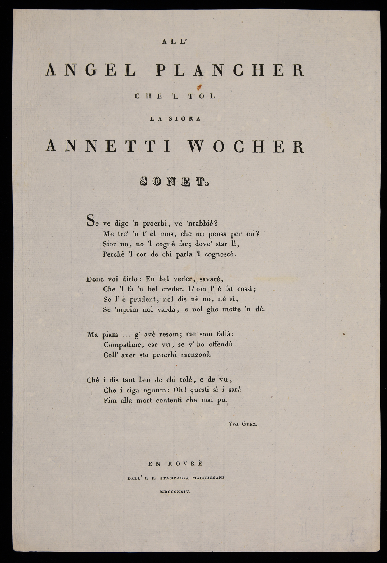 | All'Angel Plancher che 'l tol la siora Annetti Wocher, sonet |
