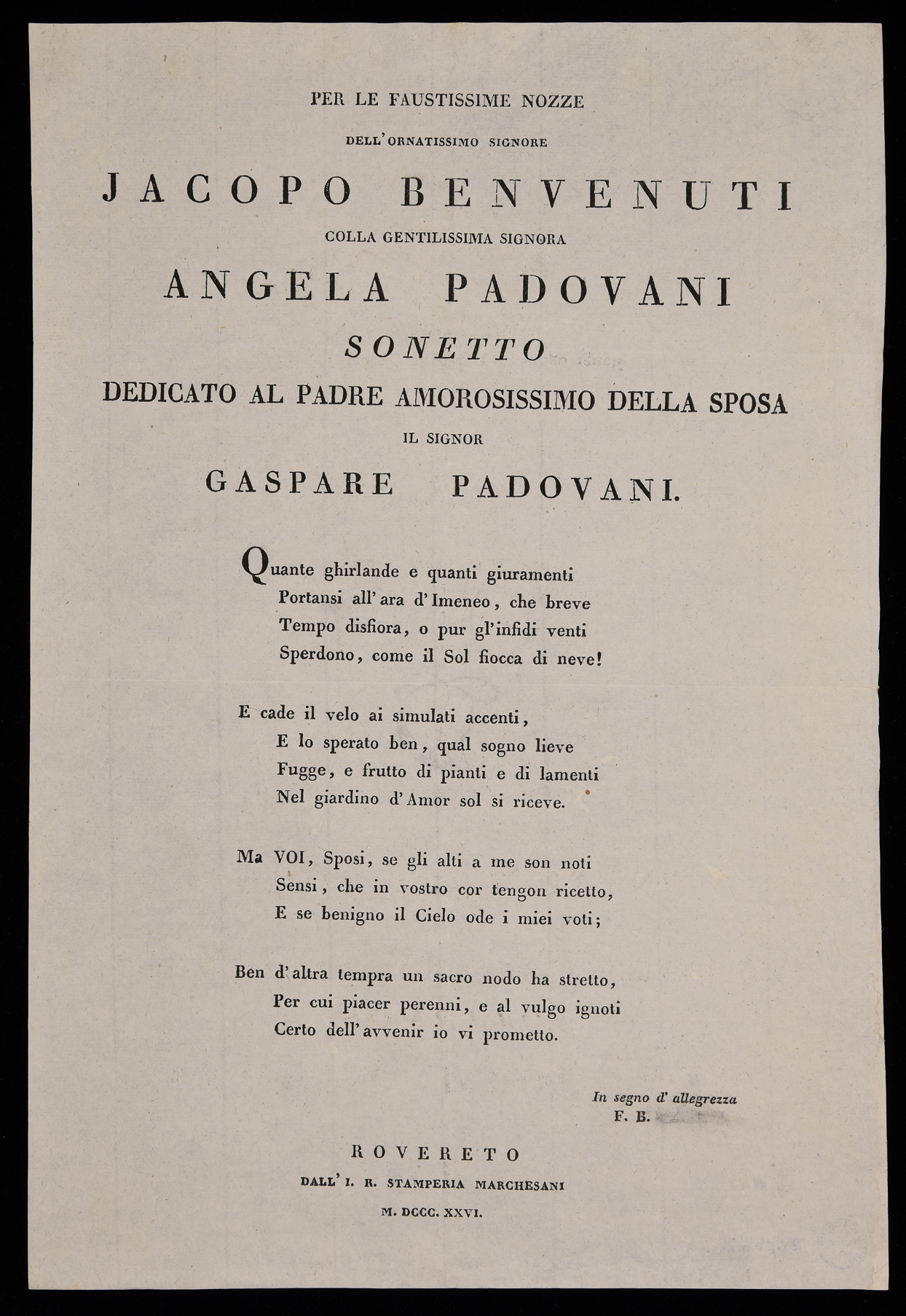 | Per le faustissime nozze dell'ornatissimo signore Jacopo Benvenuti colla gentilissima signora Angela Padovani, sonetto dedicato al padre amorosissimo della sposa il signor Gaspare Padovani |
