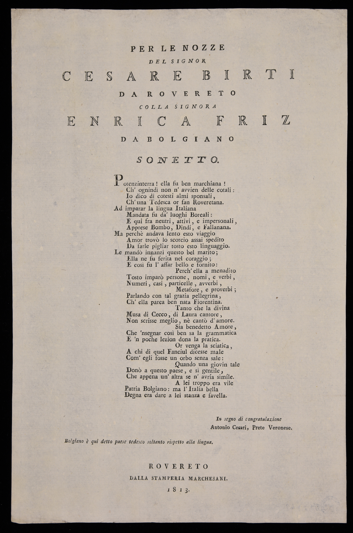 | Per le nozze del signor Cesare Birti da Rovereto colla signora Enrica Friz da Bolgiano, sonetto |