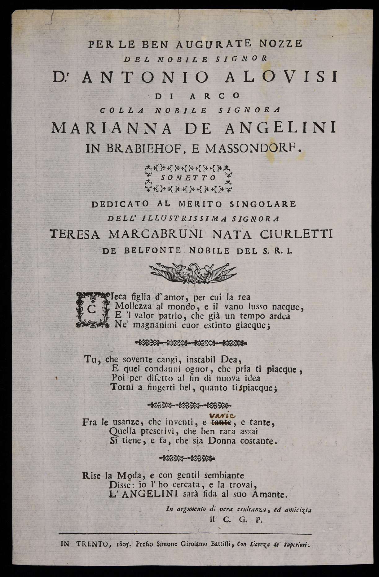 | Per le ben augurate nozze del nobile signore dr. Antonio Alovisi di Arco colla nobile signora Marianna de Angelini in Brabiehof, e Massondorf, sonetto dedicato al merito singolare dell'illustrissima signora Teresa Marcabruni nata Ciurletti de Belfonte nobile del S.R.I. |