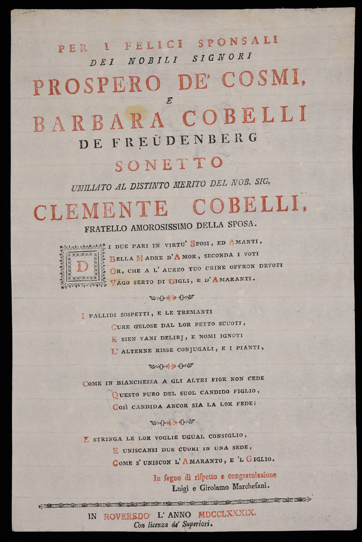 1 foglio. Dedica degli autori a Clemente Cobelli, in calce al testo: In segno di rispetto e congratulazione Luigi e Girolamo Marchesani, stampa attribuibile alla tipografia Marchesani di Rovereto in base al raffronto di caratteri e fregi