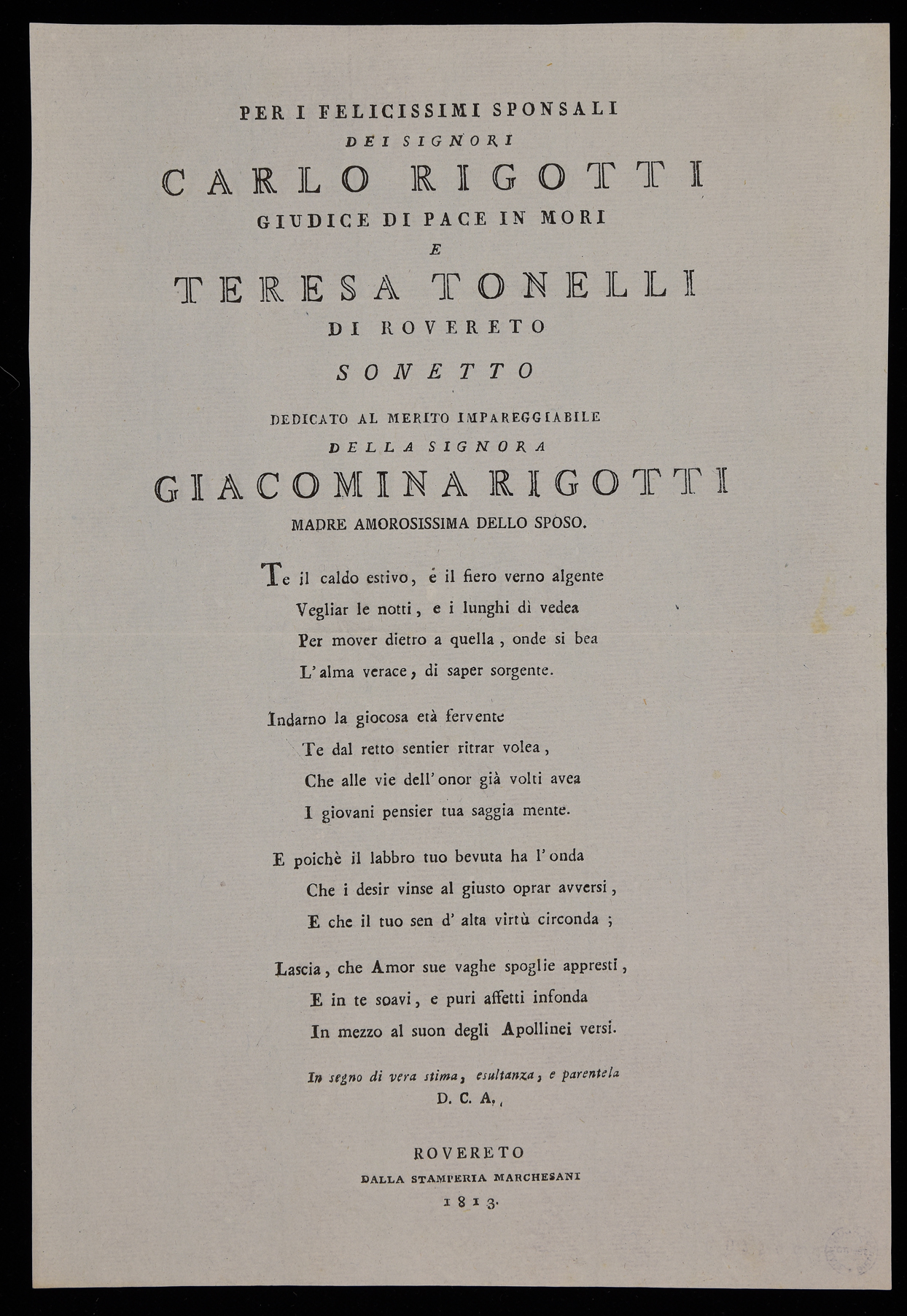 | Per i felicissimi sponsali dei signori Carlo Rigotti giudice di pace in Mori e Teresa Tonelli di Rovereto, sonetto dedicato al merito impareggiabile della signora Giacomina Rigotti madre amorosissima dello sposo |