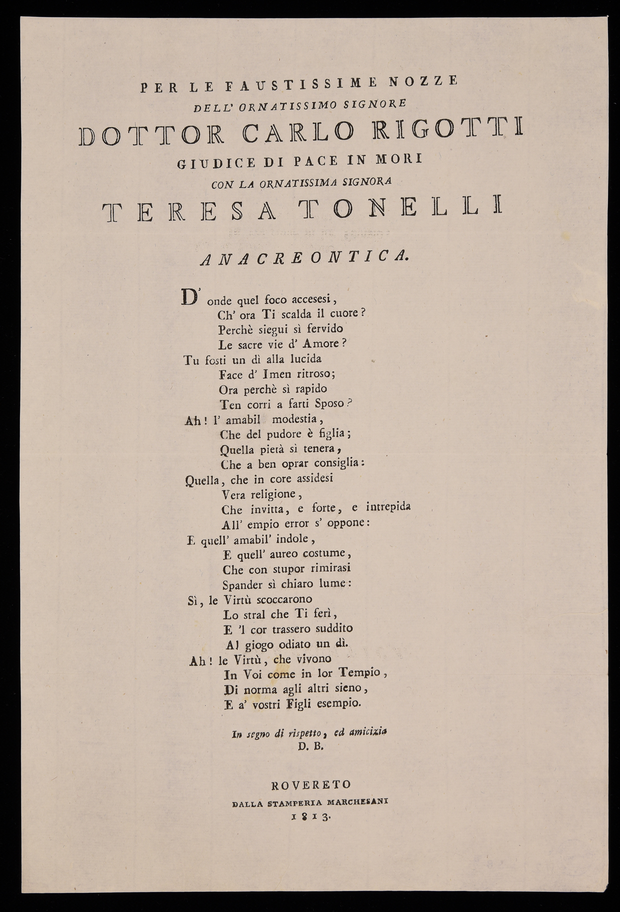 | Per le faustissime nozze dell'ornatissimo signore dottor Carlo Rigotti giudice di pace in Mori con la ornatissima signora Teresa Tonelli, anacreontica |