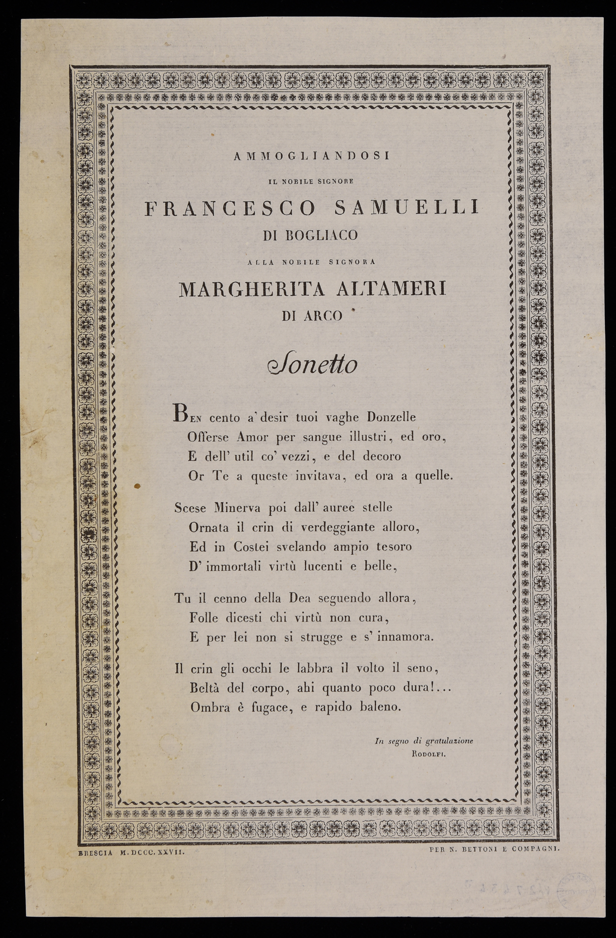 | Ammogliandosi il nobile signore Francesco Samuelli di Bogliaco alla nobile signora Margherita Altameri di Arco, sonetto |