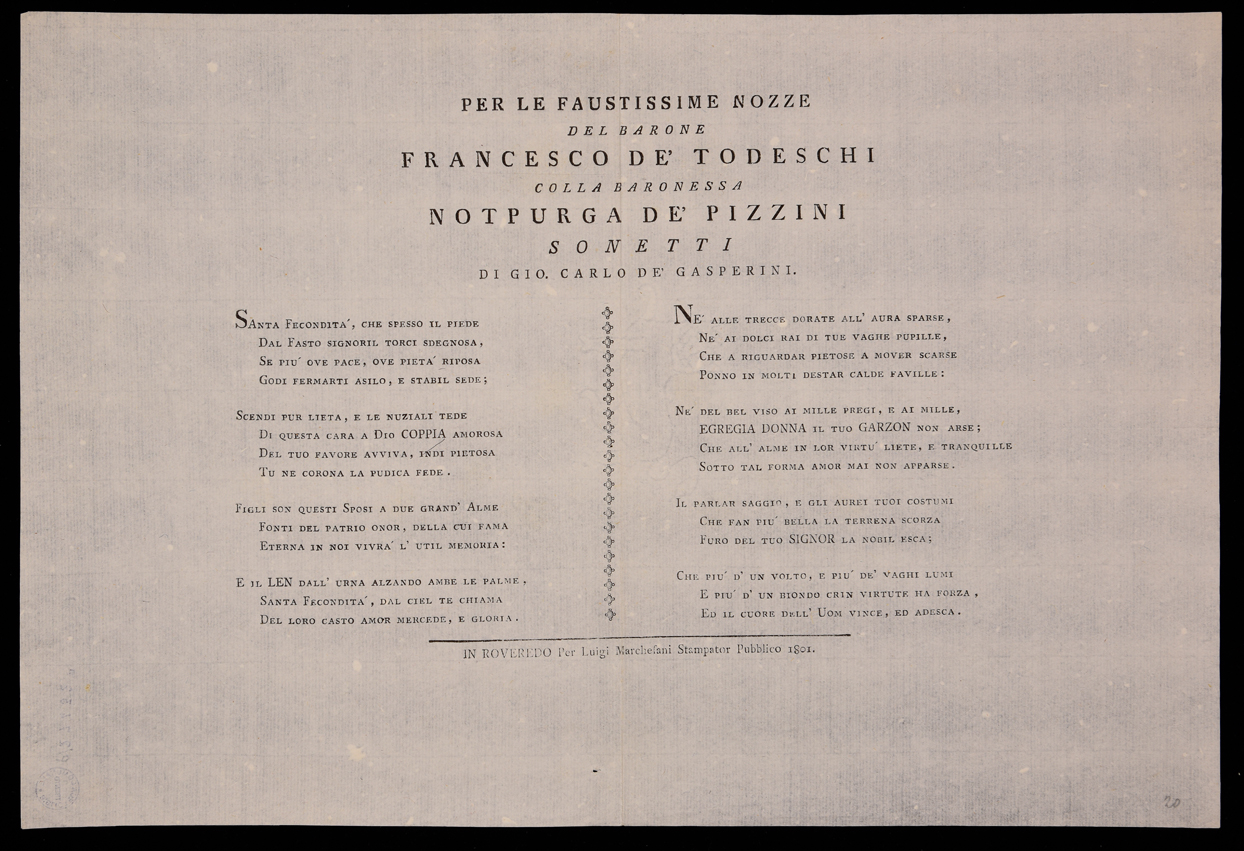 | Per le faustissime nozze del barone Francesco de' Todeschi colla baronessa Notpurga de' Pizzini, sonetti di Gio. Carlo de' Gasperini |