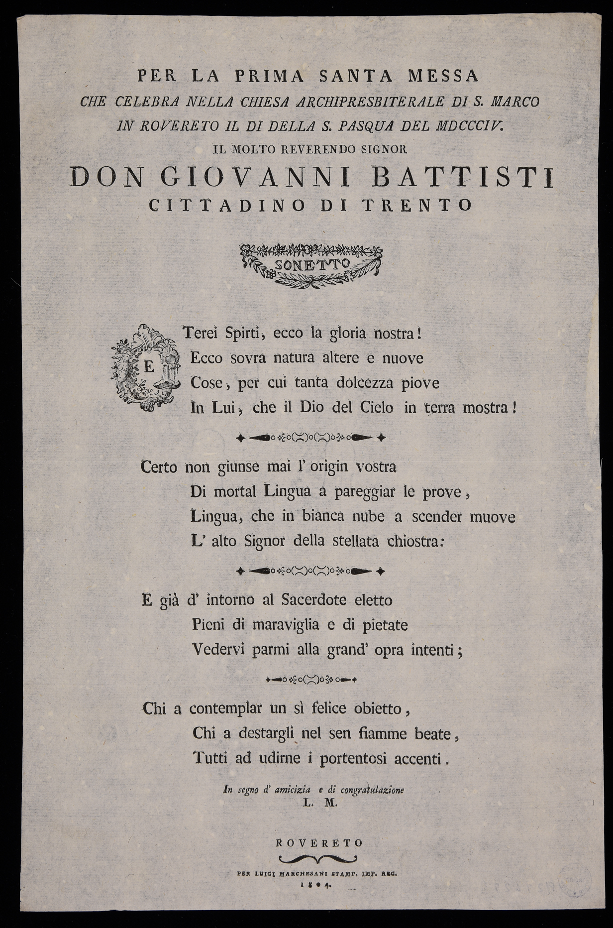 | Per la prima santa messa che celebra nella chiesa archipresbiterale di S. Marco in Rovereto il di della S. Pasqua del MDCCCIV. il molto reverendo signor don Giovanni Battisti cittadino di Trento, sonetto |