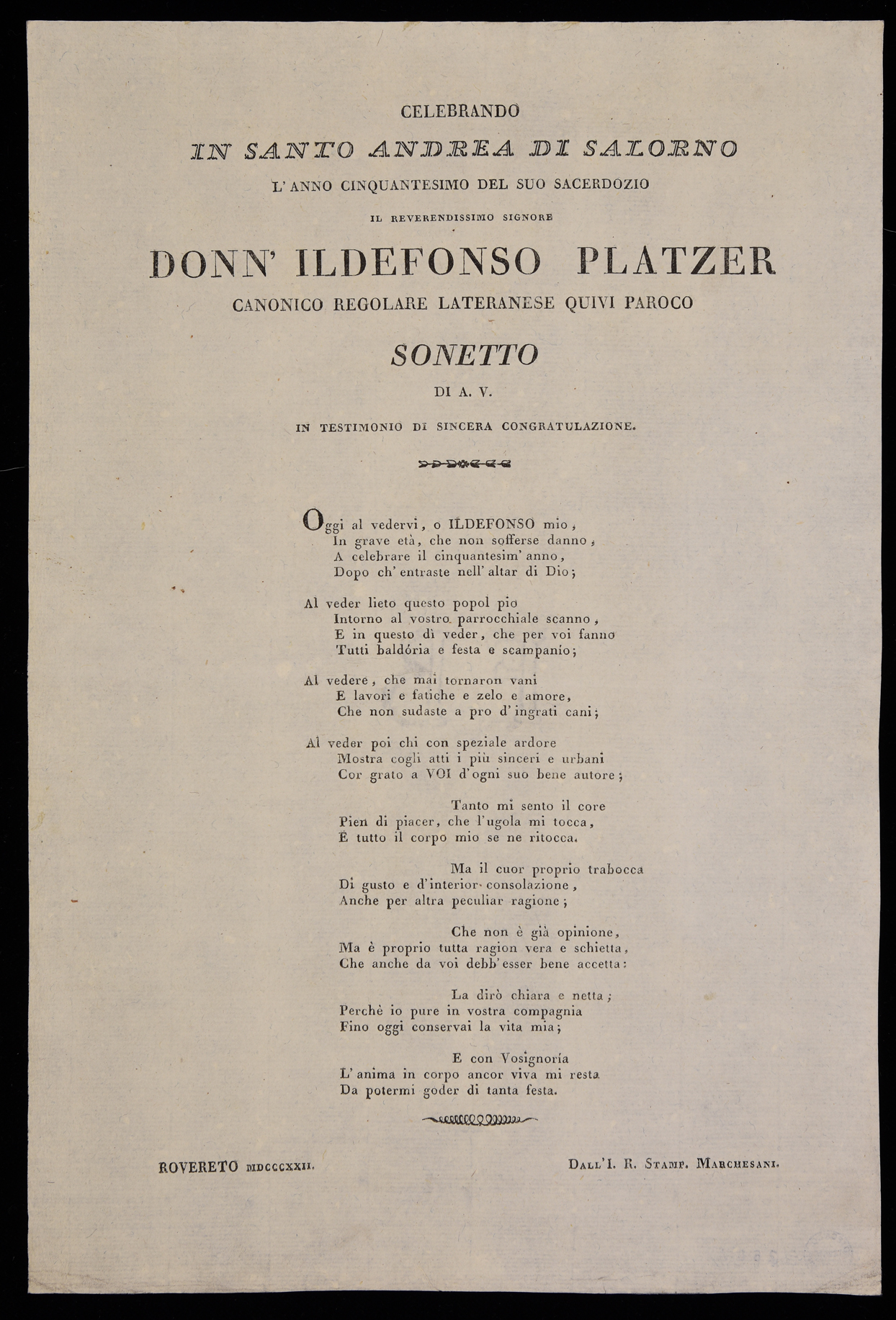 | Celebrando in Santo Andrea di Salorno l'anno cinquantesimo del suo sacerdozio il reverendissimo signore donn'Ildefonso Platzer canonico regolare lateranese quivi paroco, sonetto di A.V. in testimonio di sincera congratulazione |