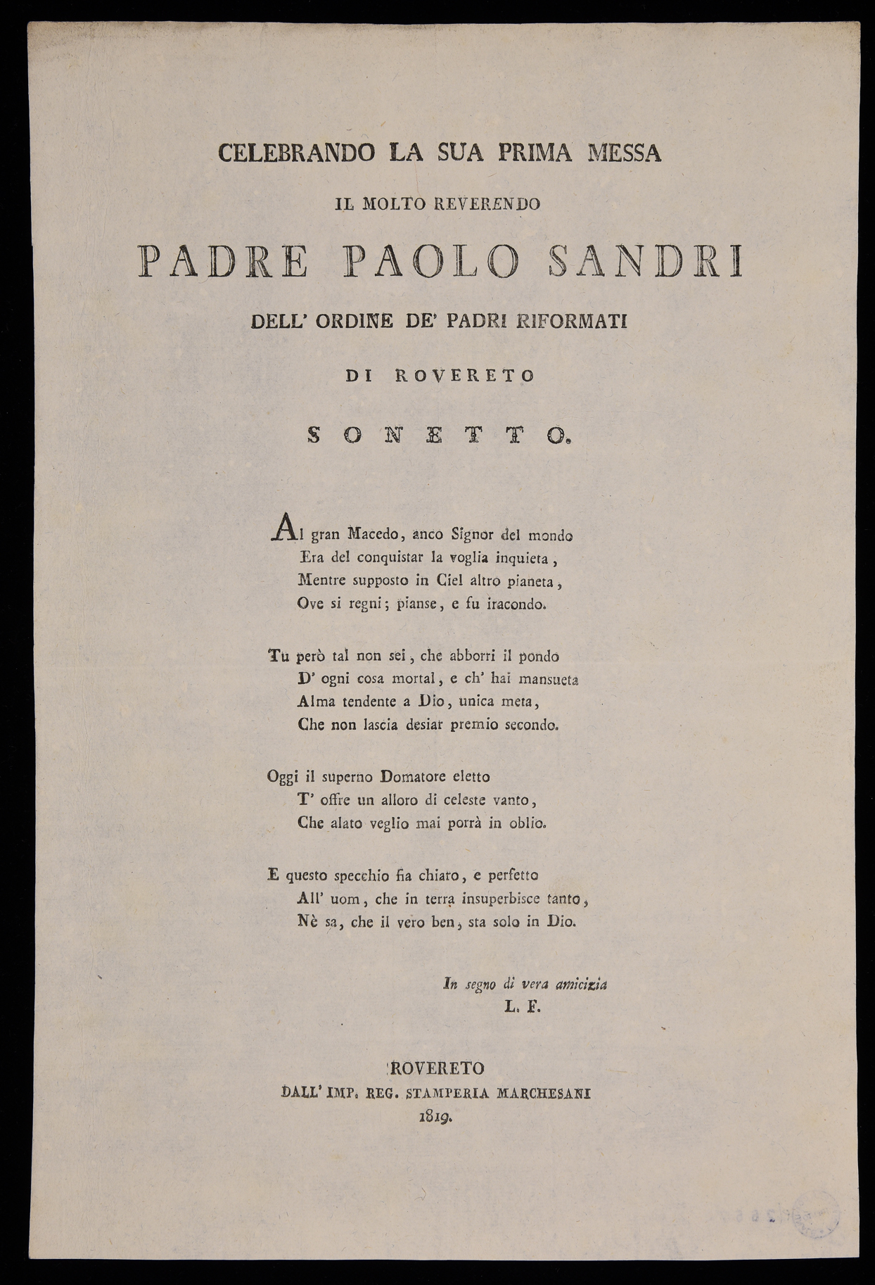 | Celebrando la sua prima messa il molto reverendo padre Paolo Sandri dell'ordine de' Padri Riformati di Rovereto, sonetto |