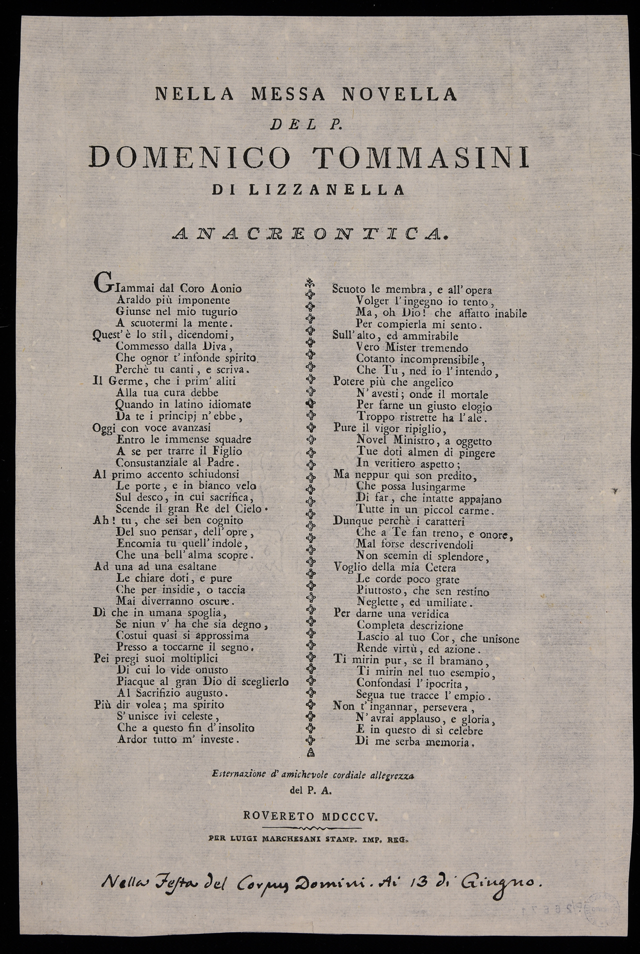 Nella messa novella del p. Domenico Tommasini di Lizzanella, anacreontica