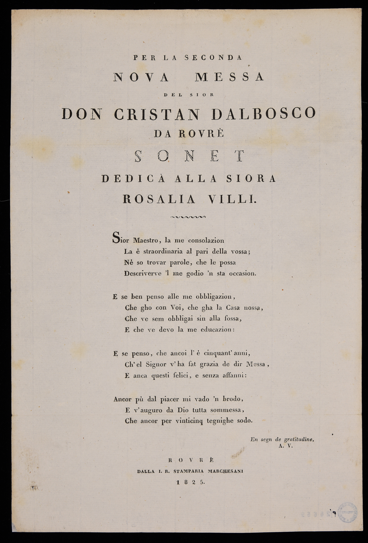 | Per la seconda nova messa del sior don Cristan Dalbosco da Rovrè, sonet dedicà alla siora Rosalia Villi |