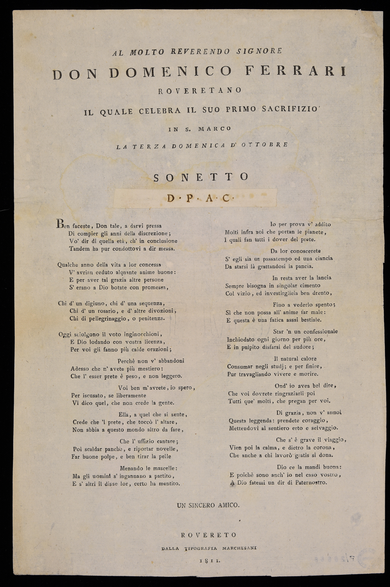 | Al molto reverendo signore don Domenico Ferrari roveretano il quale celebra il suo primo sacrifizio in S. Marco la terza domenica d'ottobre, sonetto D.P.A.C. |