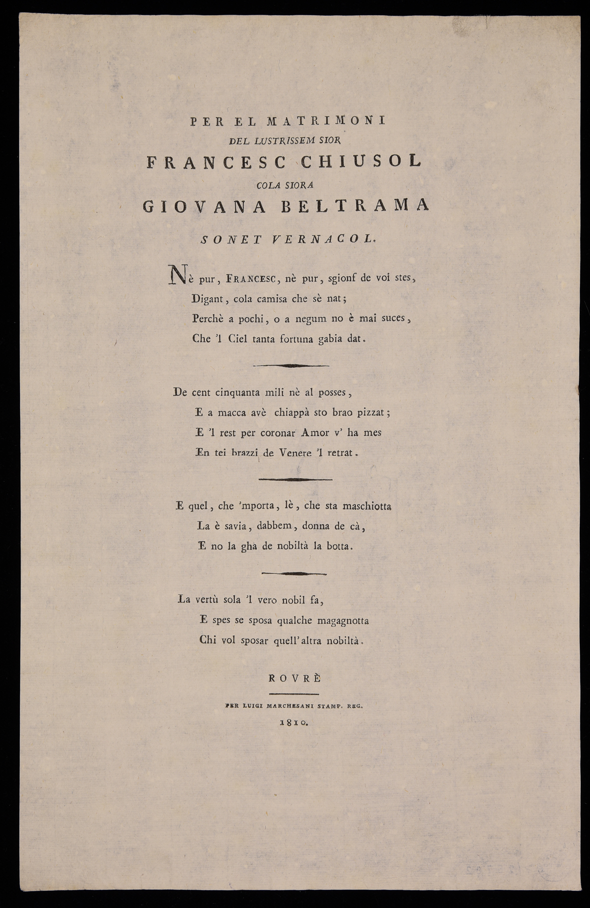 | Per el matrimoni del lustrissem sior Francesc Chiusol cola siora Giovana Beltrama, sonet vernacol |