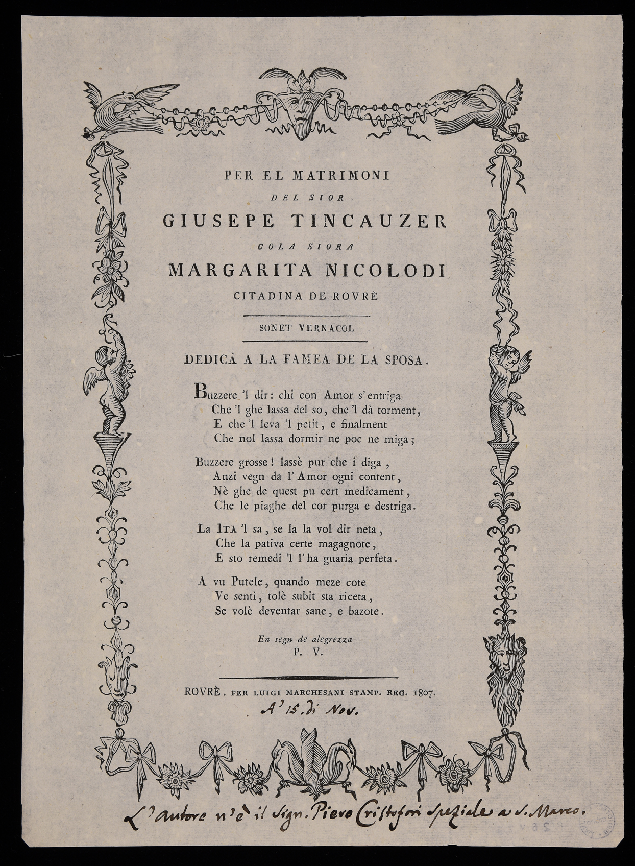| Per el matrimoni del sior Giusepe Tincauzer cola siora Margarita Nicolodi citadina de Rovrè, sonet vernacol dedicà a la famea de la sposa |