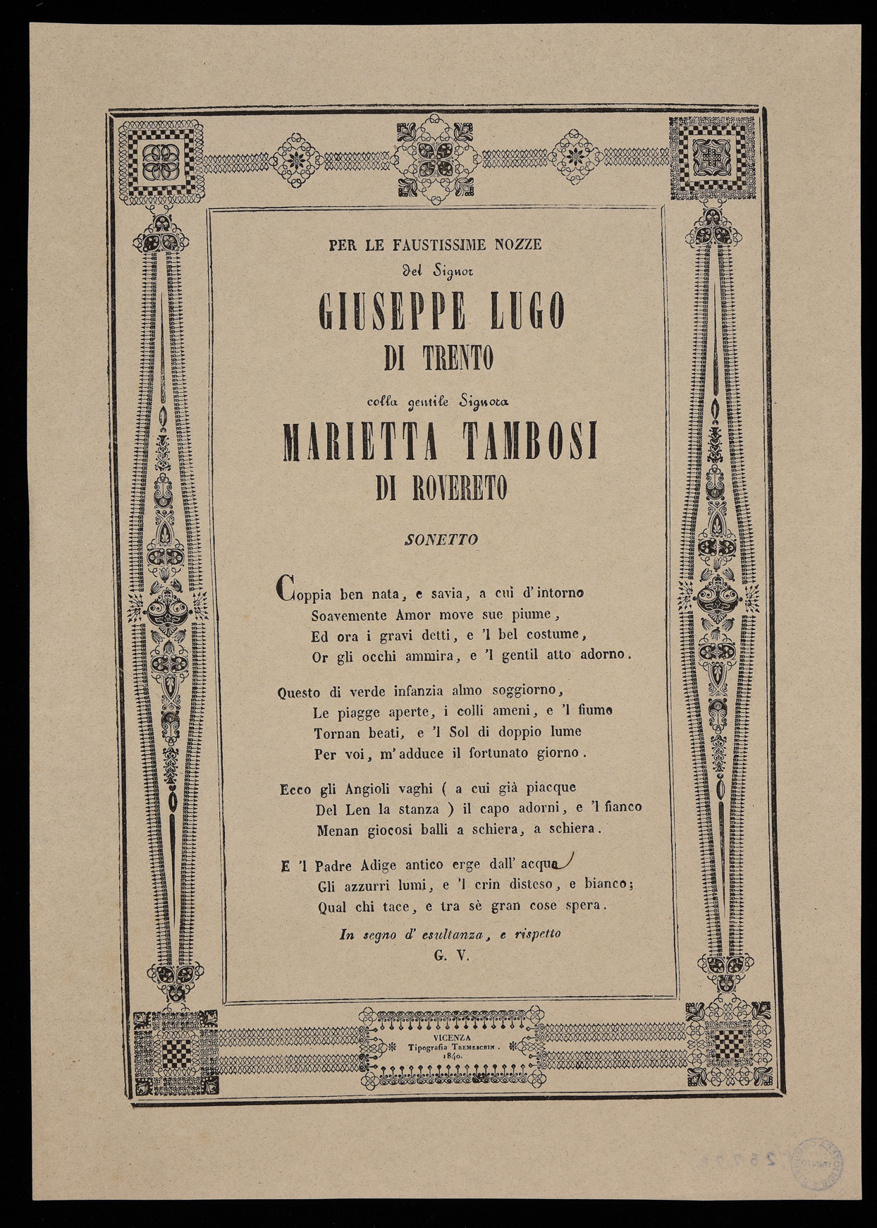 | Per le faustissime nozze del signor Giuseppe Lugo di Trento colla gentile signora Marietta Tambosi di Rovereto, sonetto |