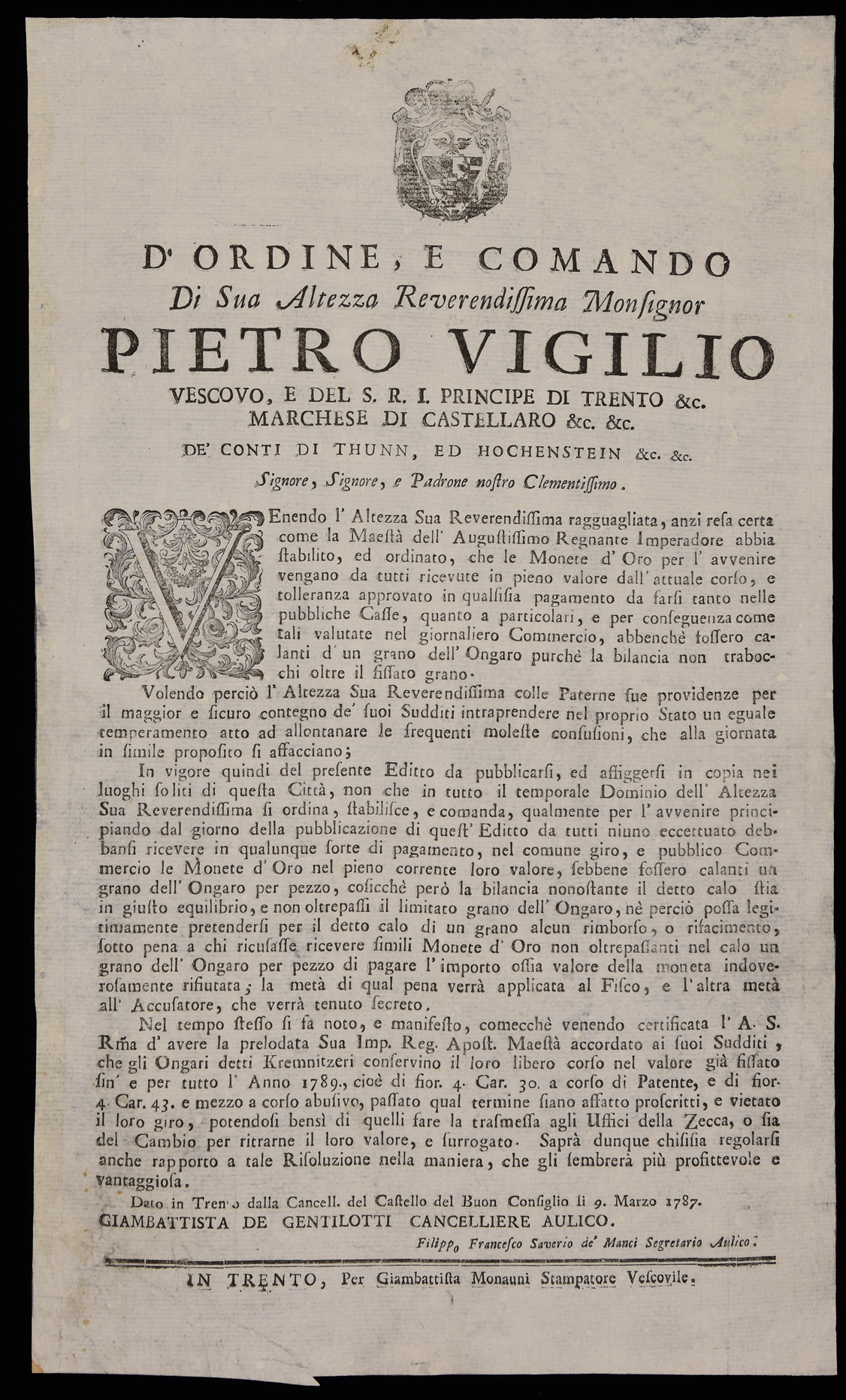 Proclama sul valore delle monete d'oro emanato il 9 marzo 1787 da Pietro Vigilio Thun, principe-vescovo di Trento, stemma di Pietro Vigilio Thun.