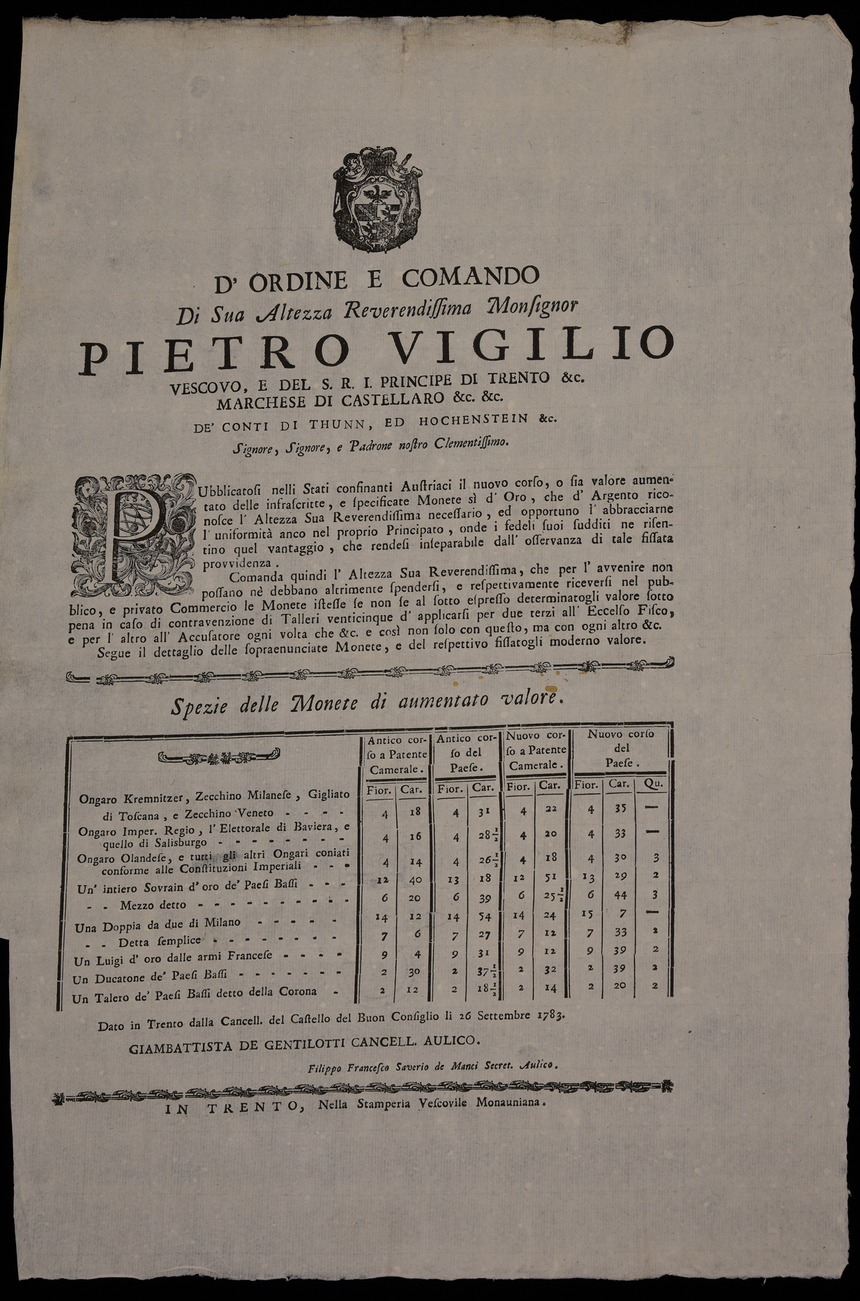 Proclama di Pietro Vigilio Thun, principe-vescovo di Trento, sul valore delle monete d'oro e d'argento, emanato il 26 settembre 1783, sottoscritto da Giambattista Gentilotti e Filippo Francesco Saverio Manci.