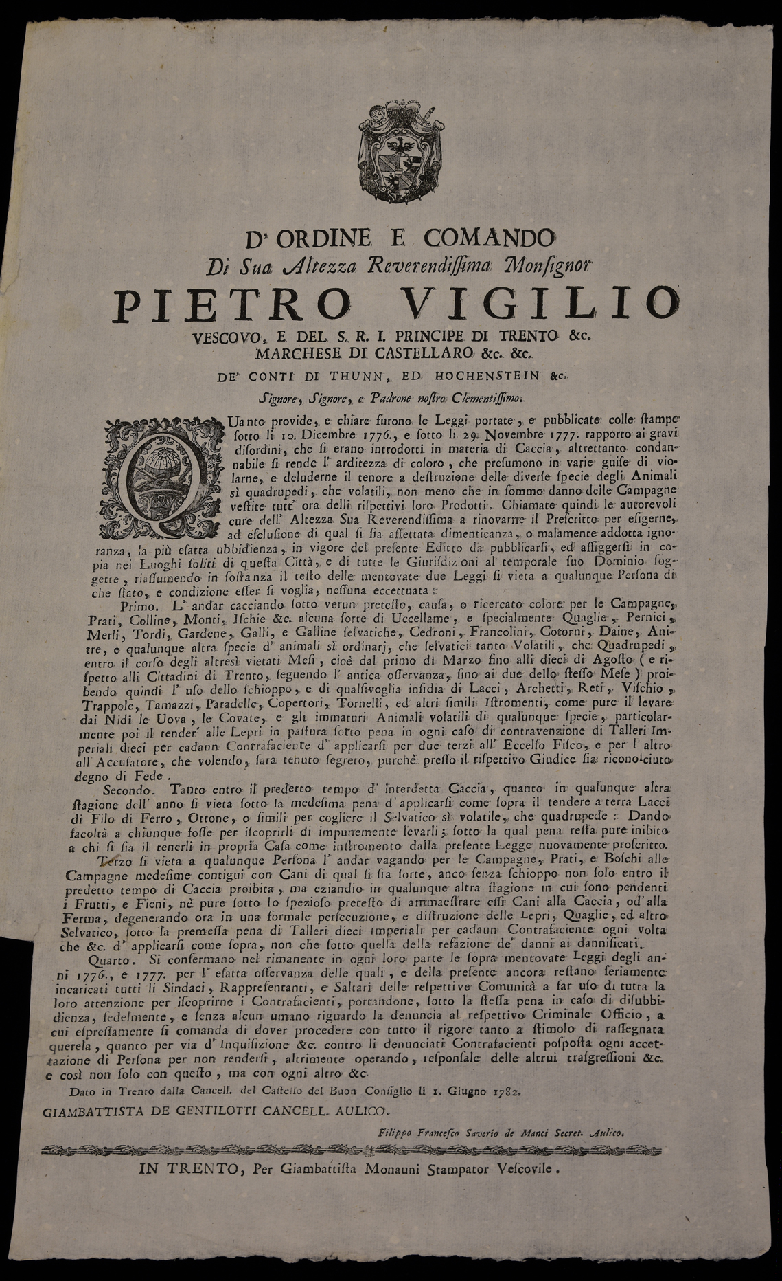 Proclama sulla caccia, emanato il 1 giugno 1782 da Pietro Vigilio Thun, principe-vescovo di Trento, stemma di Pietro Vigilio Thun, sottoscritto da Giambattista Gentilotti e Filippo Francesco Saverio Manci.