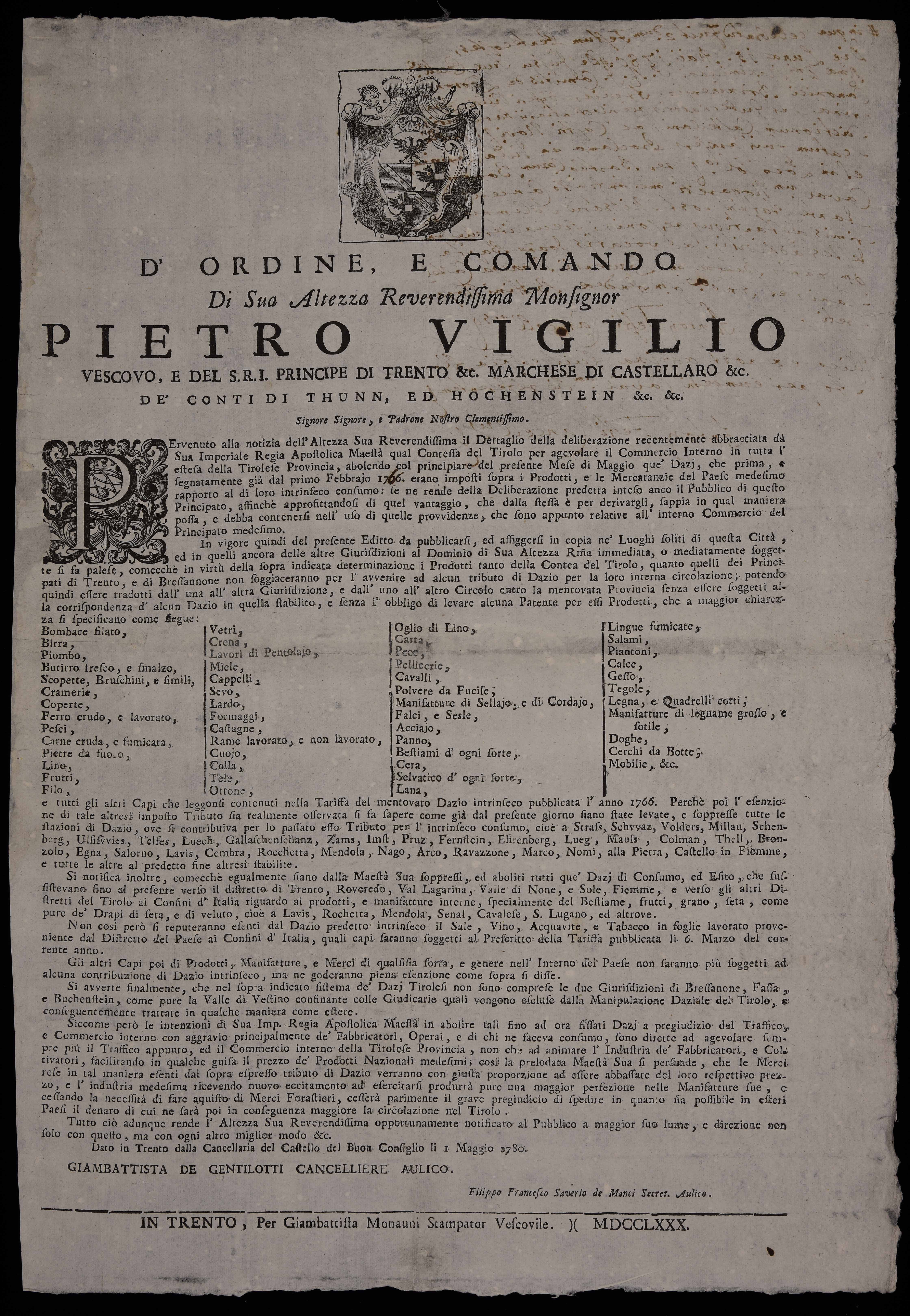 Proclama di Pietro Vigilio Thun, principe-vescovo di Trento, sull'abolizione dei dazi, emanato il 1 maggio 1780, sottoscritto da Giambattista Gentilotti e Filippo Francesco Saverio Manci.